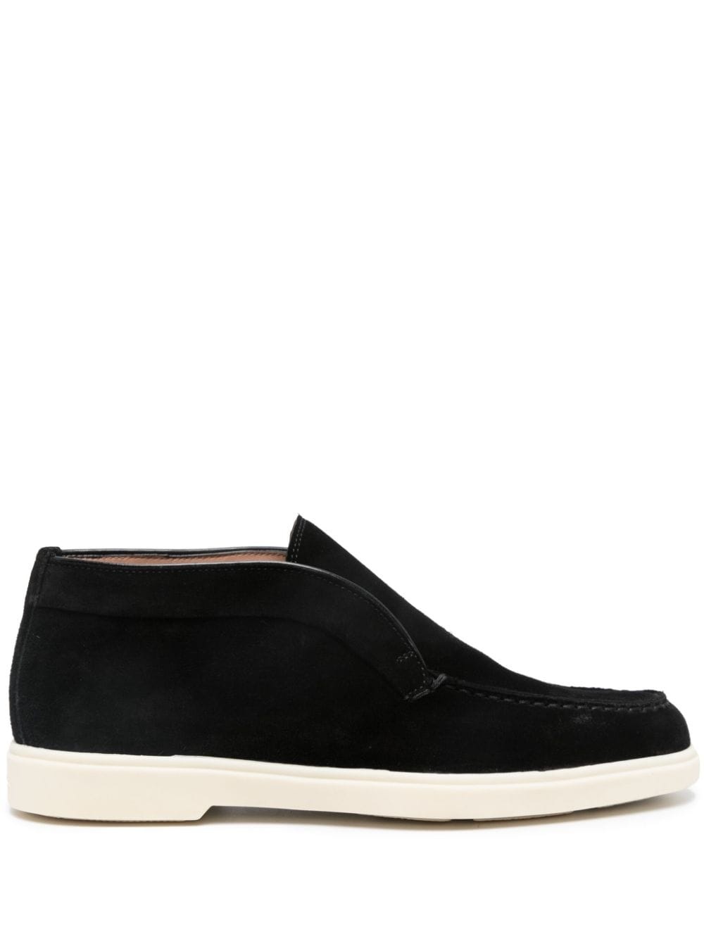 suede loafers These supple suede Santoni loafers are delivered in black and set atop a contrasting white rubber sole. Highlights - Black/white - Calf suede - Almond toe - Slip-on style - Branded insole - Rubber sole Made in Italy Composition Suede 100% SIZE & FIT Measurement HEEL 0.98 in(2.5 cm) Sole height 0.59 in(1.5 cm)