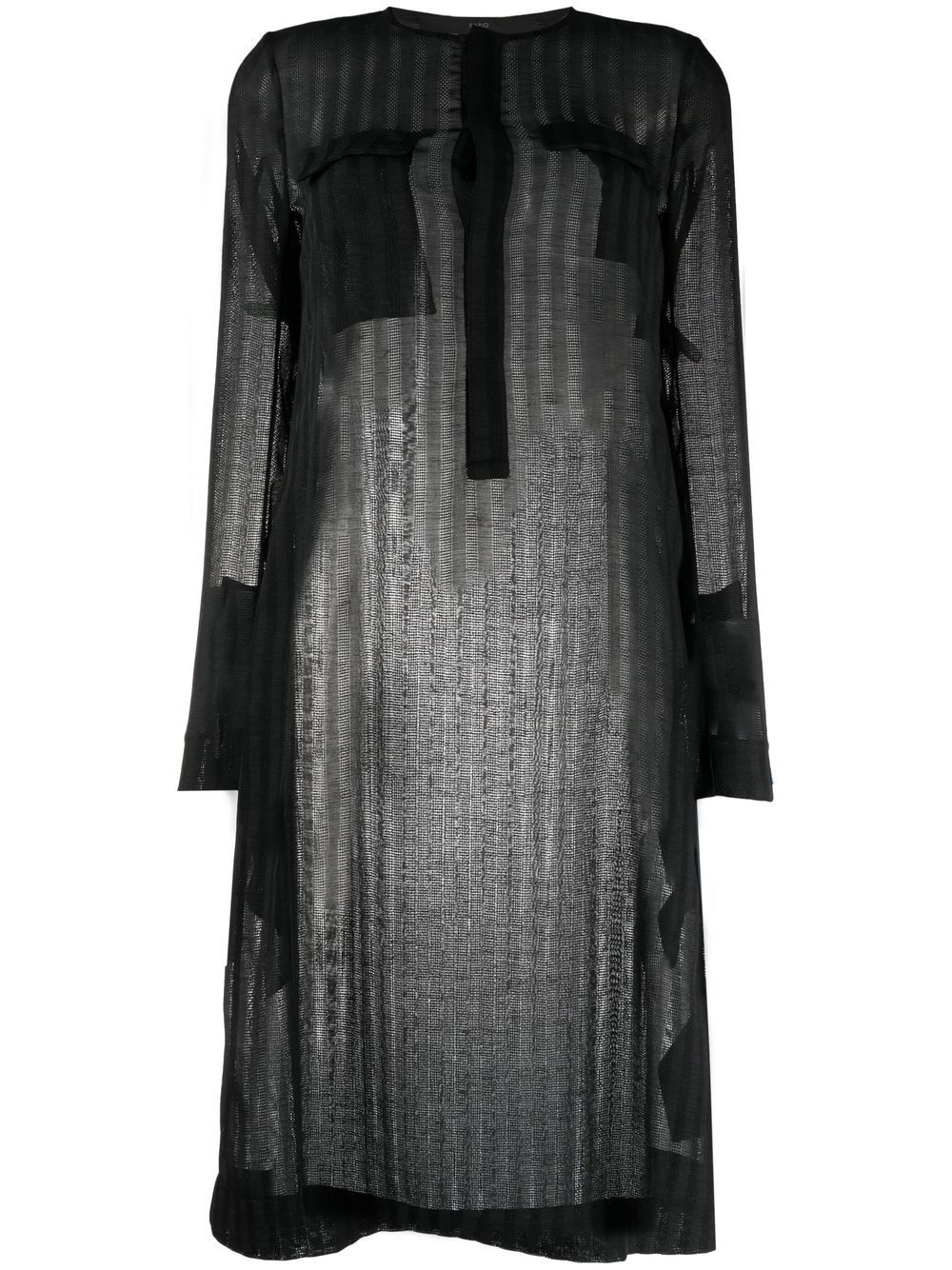 striped sheer oversized T-shirt jet-black vertical stripe pattern sheer crew neck long sleeves Made in Italy Composition Polyester 100% SIZE & FIT Model measurements Height 5 ft 10 in(1.78 m) Bust/Chest 33.46 in(85 cm) Hips 36.22 in(92 cm) Waist 23.22 in(59 cm) FittingInformation This piece fits true to size. We recommend you get your regular size Cut for a loose fit Made with a mid-weight non-stretch fabric