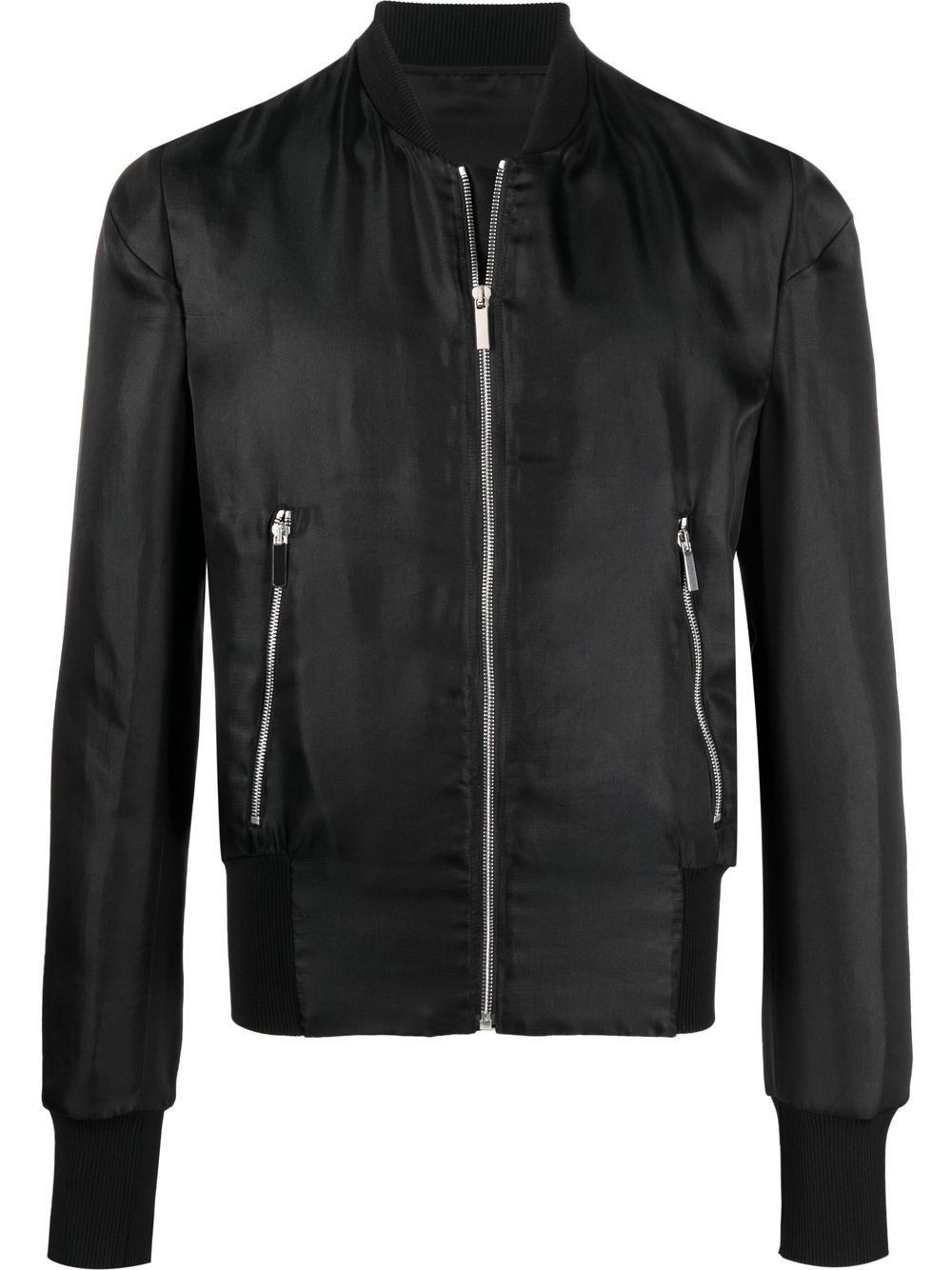 zipped-up bomber jacket black silk ribbed detailing round neck front zip fastening long sleeves front zip fastening pockets Made in Italy Composition Acetate 70%, Silk 30% SIZE & FIT Model measurements Height 6 ft 2 in(1.88 m) Bust/Chest 36.61 in(93 cm) Hips 35.82 in(91 cm) Waist 27.95 in(71 cm)