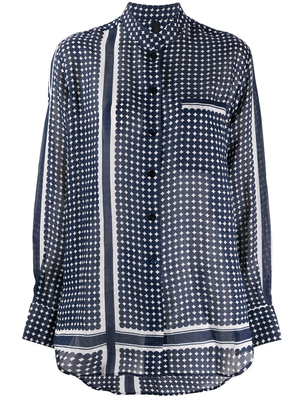 geometric-print long-sleeved shirt Navy blue ramie geometric-print long-sleeved shirt from Sara Lanzi featuring a geometric print, a classic collar, a front button fastening, long sleeves and a chest pocket. POSITIVELY CONSCIOUS: At least 50% of the main material of this product meets our conscious criteria: for example, it's either organic, recycled, upcycled, or independently recognised as being better for the environment (such as linen, ramie, Tencel, etc.) Made in Italy Composition Ramie 100% SIZE & FIT Model measurements Height 5 ft 10 in(1.78 m) Bust/Chest 33.07 in(84 cm) Hips 35.82 in(91 cm) Waist 25.98 in(66 cm) FittingInformation This piece fits true to size. We recommend you get your regular size Cut for a loose fit Made with a lightweight non-stretch fabric Washing instructions Dry Clean Only