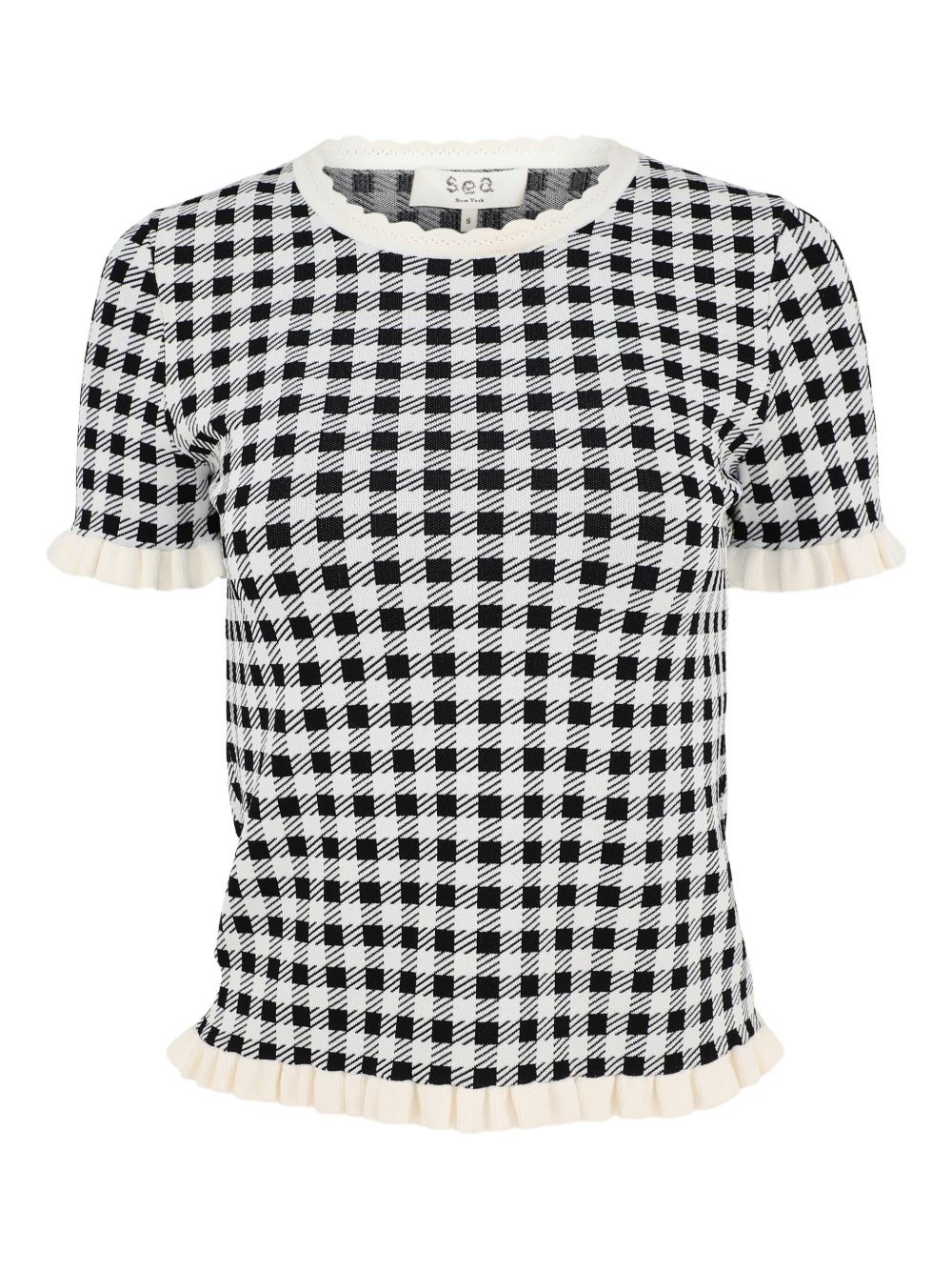 gingham-pattern blouse Highlights - Black and white - Gingham pattern - Ruffled detail - Short sleeves - Round neck Imported Composition Viscose 83%, Elastane 17% Washing instructions Read Manufacturer Guidelines