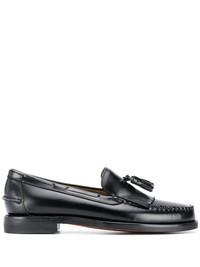 casual finger loafers black leather round toe fringe detailing slip-on style branded insole low stacked heel rubber sole Imported Composition Outer: Leather 100% Lining: Leather 100%, Suede 100% Sole: Leather 100%, Rubber 100% SIZE & FIT Measurement HEEL 0.98 in(2.5 cm) Sole height 0.39 in(1 cm)