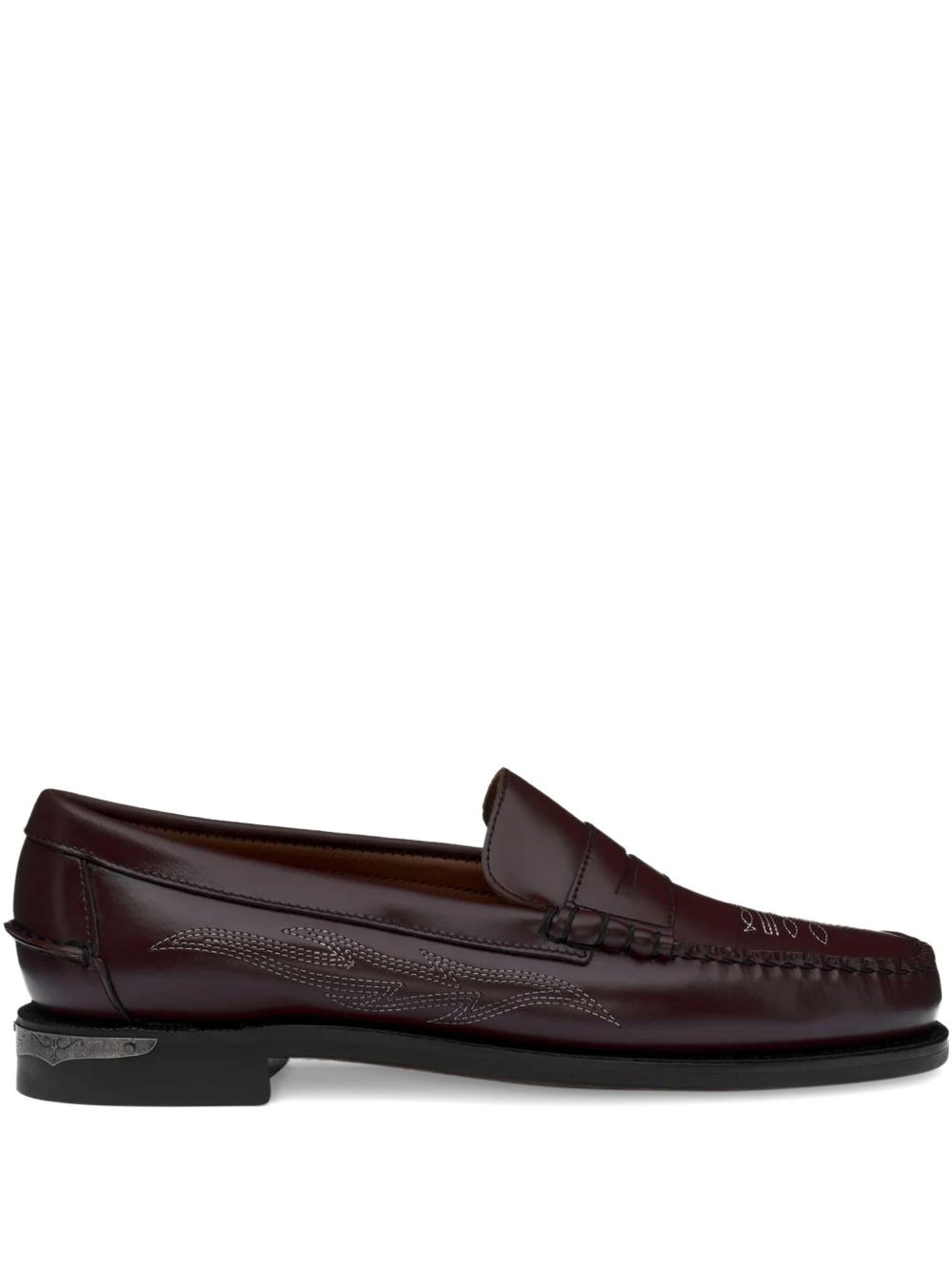 Dan El Paso embroidered penny loafers Highlights - Brown burgundy - Embroidered detail - Penny bar - Stacked heel - Topstitching - Rubber sole Imported Composition Outer: Leather 100% Lining: Leather 100% Sole: Leather 100%