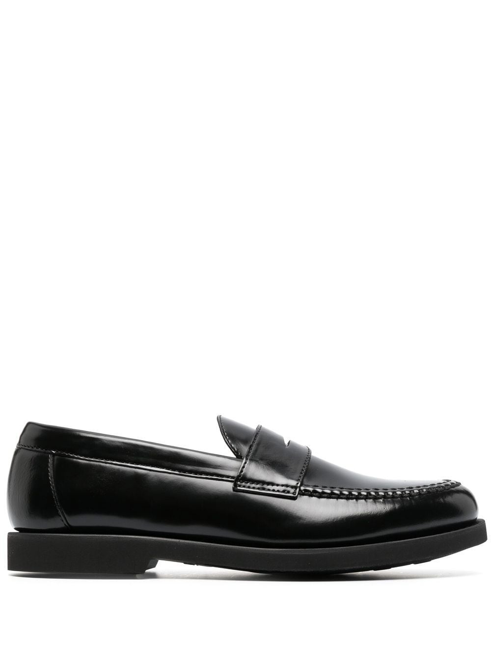 slip-on 24mm leather loafers jet black calf leather penny slot round toe low heel slip-on style Made in United Kingdom Composition Outer: Calf Leather 100% Lining: Calf Leather 100% Sole: Rubber 100% SIZE & FIT Measurement HEEL 0.98 in(2.5 cm) Sole height 0.39 in(1 cm)