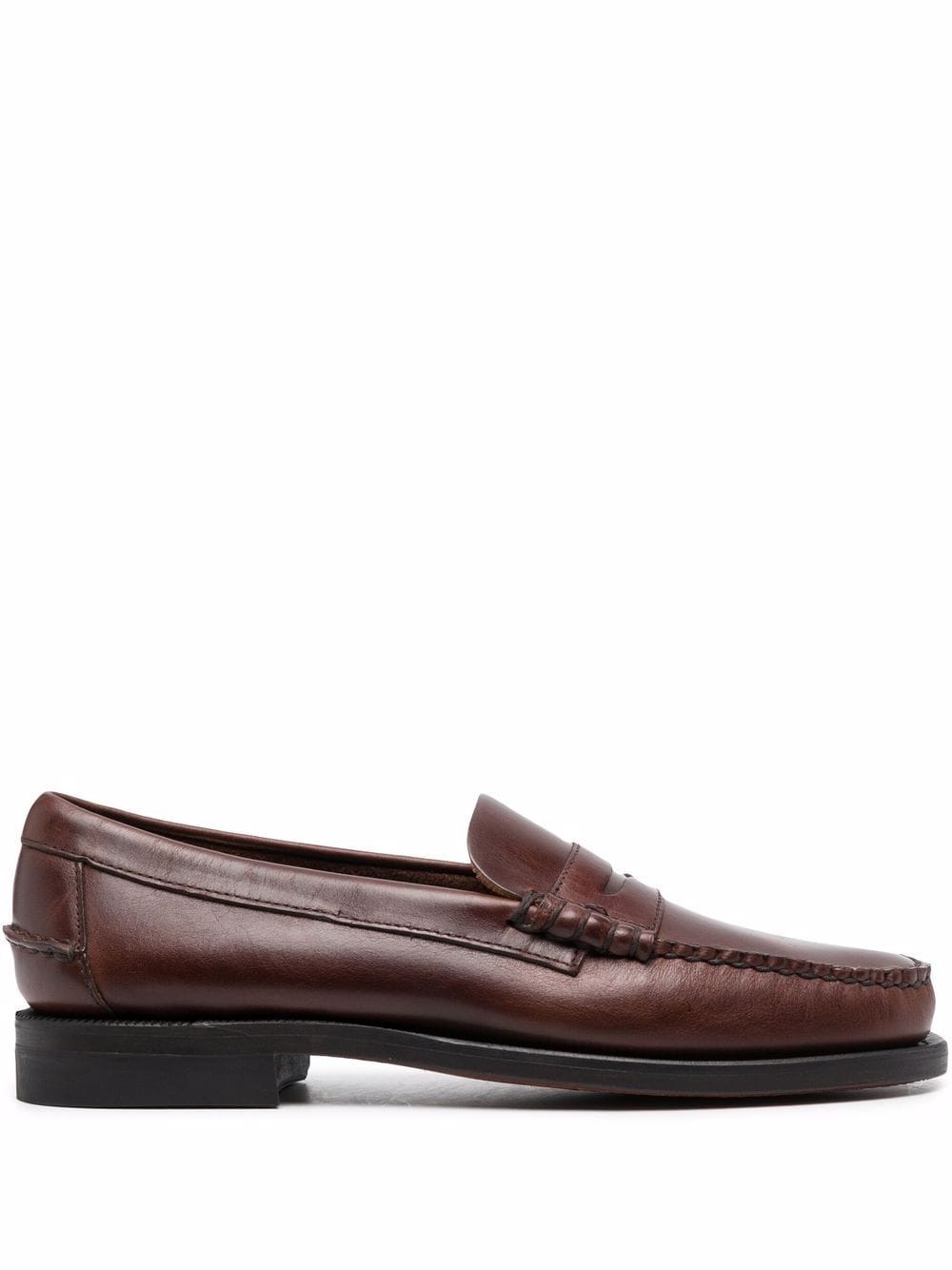 slip-on leather loafers cinnamon-brown leather slip-on style branded insole round toe low heel Imported Composition Sole: Leather 100% Lining: Leather 100% Outer: Leather 100% SIZE & FIT Measurement HEEL 0.98 in(2.5 cm) Sole height 0.39 in(1 cm)