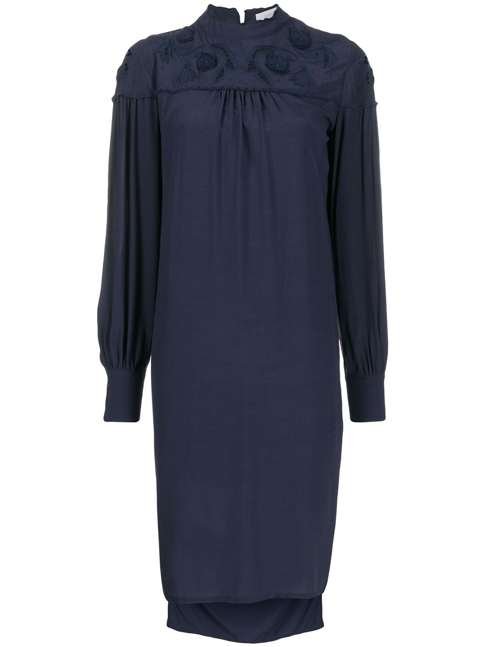 floral embroidered shift dress See by Chloe speaks to a youthful generation with clean feminine designs, ruffled details, airy fabrics and a carefree bohemian spirit. Case in point: this ink navy floral embroidered shift dress. Featuring a round neck, a back button fastening, cut out details, long sleeves, fitted cuffs and a high low hem. Imported Composition Polyester 100%, Viscose 100% Washing instructions Dry Clean Only