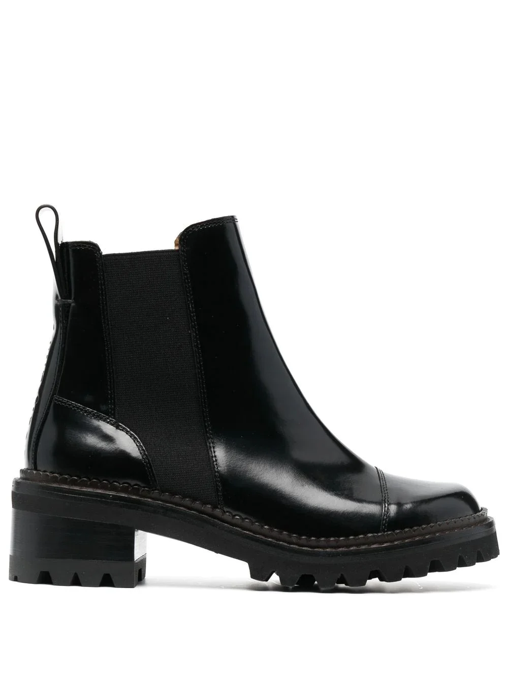 leather Chelsea boots Highlights - Black - Calf leather - High-shine finish - Elasticated side panels - Round toe - Pull-tab at the heel - Ankle-length - Pull-on style - Low heel - Branded insole - Rubber lug sole Imported Composition Lining: Calf Leather 100% Outer: Calf Leather 100% Sole: Rubber 100% SIZE & FIT Measurement CIRCUMFERENCE 8.66 in(22 cm) HEEL 1.96 in(5 cm) HEIGHT 4.72 in(12 cm) Sole height 0.78 in(2 cm)