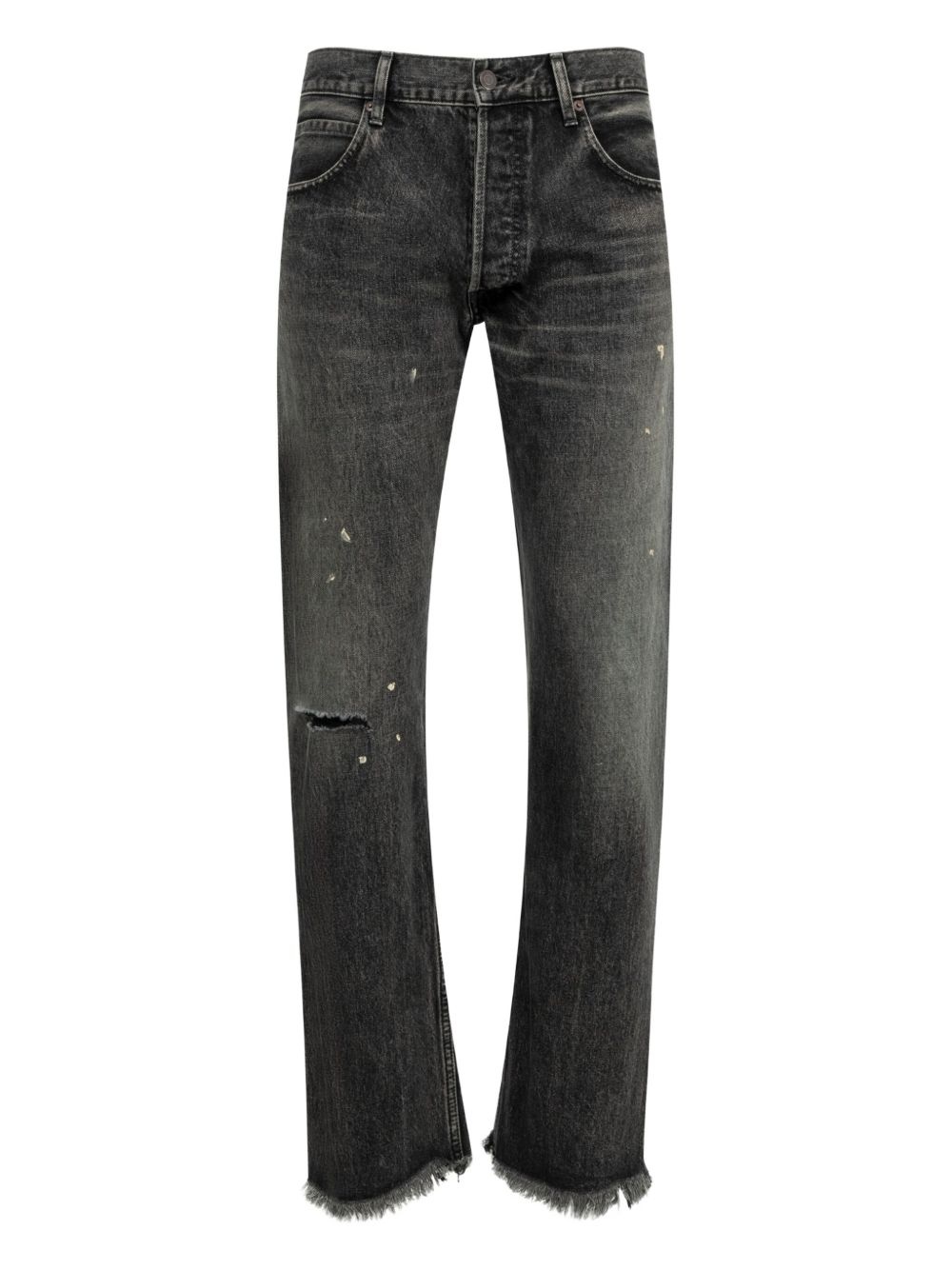 distressed jeans Highlights - Desert wash black - Distressed detail - Raw cut hem - Leather patch - Five-pocket styling - Button fly Imported Composition Cotton 100% Washing instructions Read Manufacturer Guidelines