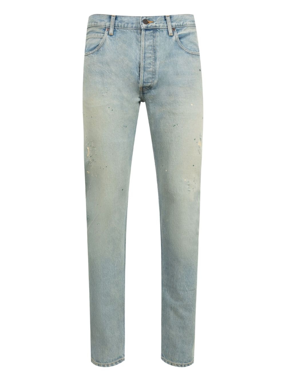 distressed jeans Highlights - Light blue - Paint splatters - Distressed effect - Five pockets - Button fly - Leather patch Imported Composition Cotton 100% Washing instructions Read Manufacturer Guidelines