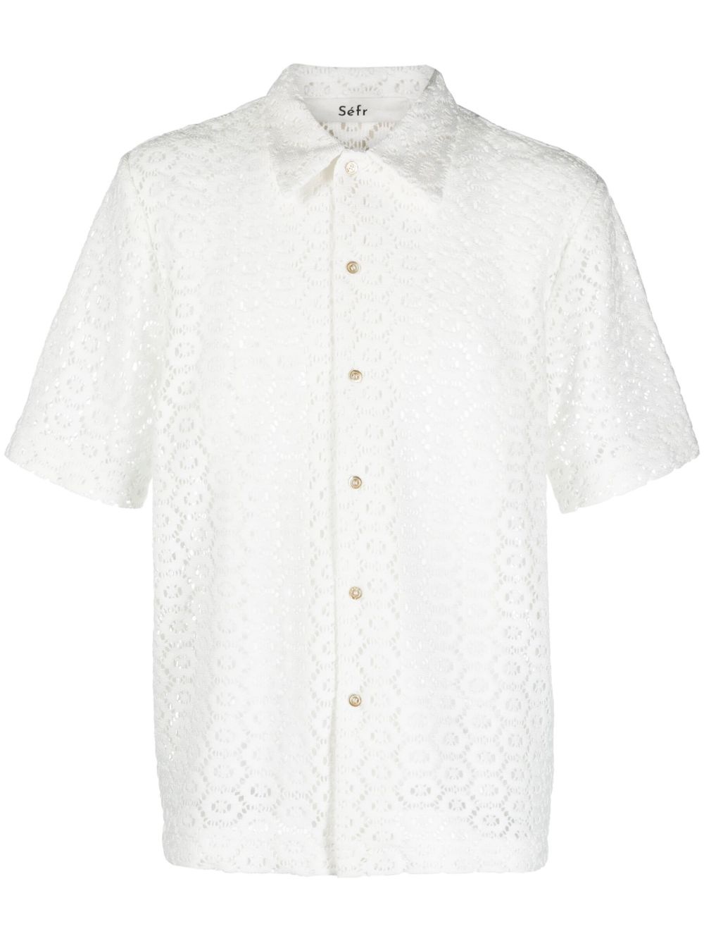 pointelle-knit shirt Highlights - White - Cotton blend - Pointelle knit - Pointed flat collar - Front button fastening - Short sleeves - Straight hem Imported Composition Cotton 85%, Polyamide 15% SIZE & FIT Model measurements Height 6 ft 0 in(1.84 m) Bust/Chest 36.22 in(92 cm) Hips 35.43 in(90 cm) Waist 26.77 in(68 cm) Measurement CHEST 40.94 in(104 cm) SLEEVE LENGTH 11.02 in(28 cm) Shoulder Width 17.32 in(44 cm) LENGTH 27.95 in(71 cm) WAIST 40.15 in(102 cm)