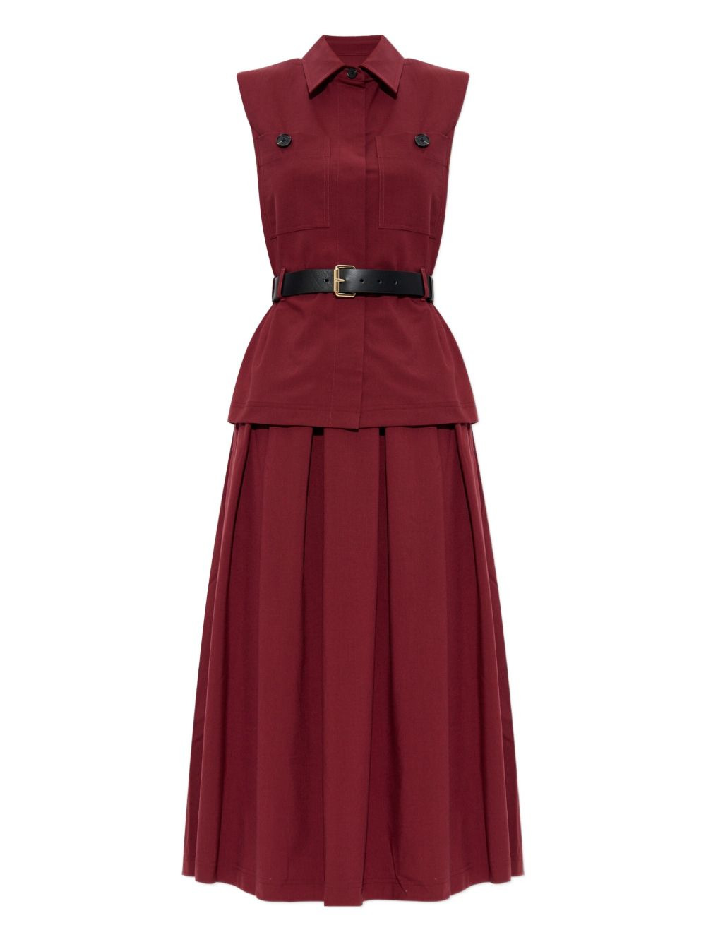 belted pleated dress Highlights - Burgundy - Sleeveless - Pleated skirt - Front button fastening - A-line Imported Composition Polyester 82%, Lyocell 10%, Wool 5%, Elastane 3% Washing instructions Read Manufacturer Guidelines