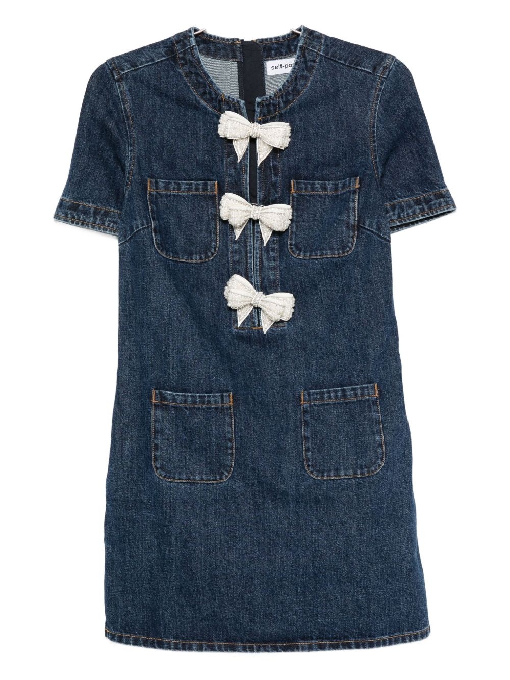 bow-embellished denim dress Highlights - Blue - Denim - Three embellished bows - Short sleeves - Round neck - Patch pockets Imported Composition Cotton 100% SIZE & FIT Model measurements Height 5 ft 9 in(1.75 m) Bust/Chest 32.67 in(83 cm) Hips 36.22 in(92 cm) Waist 24.8 in(63 cm) FittingInformation Designed for a relaxed fit, this piece allows for comfort and movement when worn Sturdy and hard-wearing, this denim piece offers no stretch