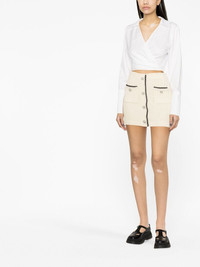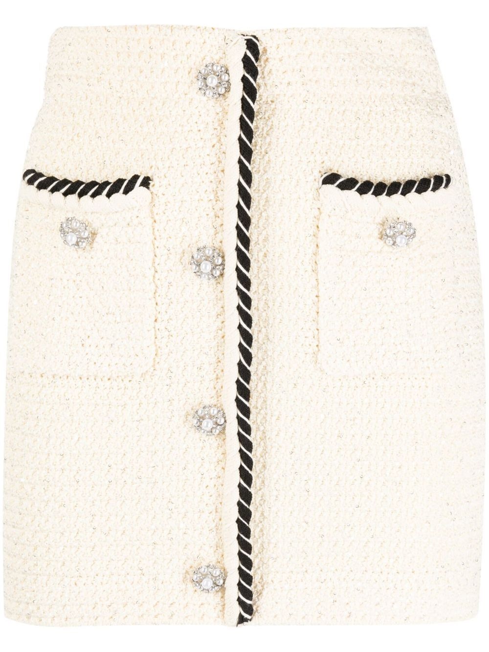 braided-trim knitted skirt Knitted from beige sequinned fabric for a shimmering look, this high-waisted skirt from Self-Portrait is aligned with the label's refined style. Braided trims and faux-pearl buttons add to that elegant aesthetic. Imported Composition Polyester 47%, Viscose 33%, Polyamide 20% SIZE & FIT Model measurements Height 5 ft 10 in(1.77 m) Bust/Chest 32.67 in(83 cm) Hips 35.43 in(90 cm) Waist 23.62 in(60 cm) FittingInformation This piece fits true to size. We recommend you get your regular size Cut for a slim fit Made with a mid-weight fabric Washing instructions Dry Clean Only