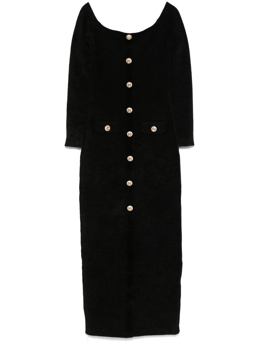 chenille knit maxi dress Highlights - Black - Two front flap pockets - Off-shoulder - Decorative button detailing - Long sleeves Imported Composition Viscose 50%, Polyester 28%, Polyamide 22% SIZE & FIT Model measurements Height 5 ft 10 in(1.78 m) Bust/Chest 33.85 in(86 cm) Hips 36.61 in(93 cm) Waist 26.77 in(68 cm) FittingInformation Designed for a close fit throughout The elasticated shoulders offer movement and a comfortable fit Made with a midweight knit, this piece offers some stretch Washing instructions Dry Clean Only