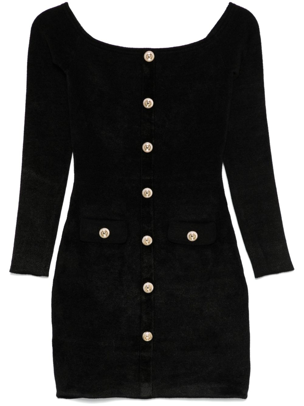 chenille knit mini dress Highlights - Black - Two front flap pockets - Off-shoulder - Decorative button detailing - Long sleeves Imported Composition Viscose 50%, Polyester 28%, Polyamide 22% SIZE & FIT Model measurements Height 5 ft 10 in(1.77 m) Bust/Chest 32.28 in(82 cm) Hips 35.03 in(89 cm) Waist 25.19 in(64 cm) FittingInformation Designed for a close fit throughout Made with a midweight knit, this piece offers some stretch