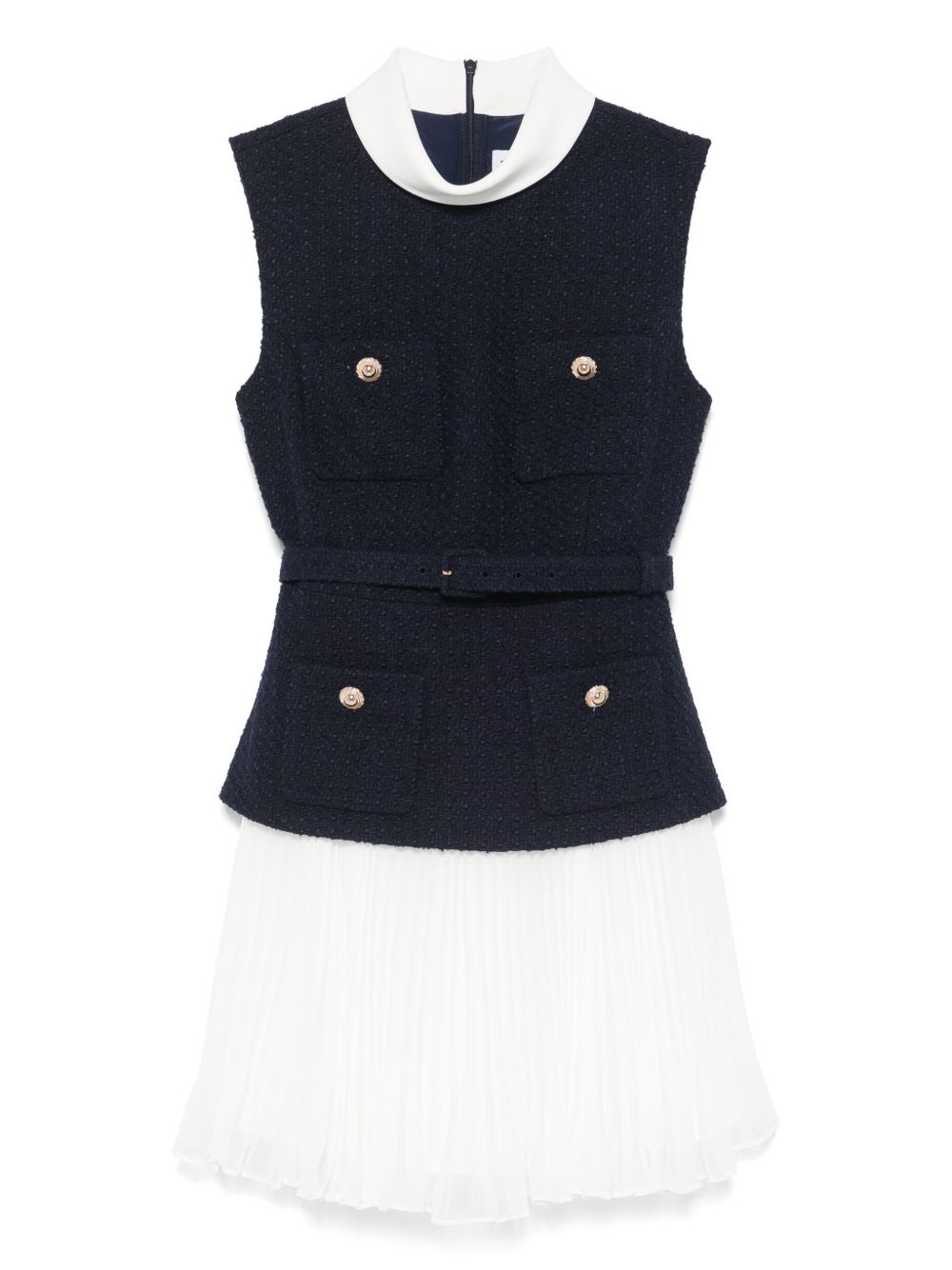 chiffon mini dress Highlights - Navy blue - Belted waist - Concealed rear zip fastening - Decorative button detailing - Pleated skirt Imported Composition Outer: Polyester 41%, Acrylic 25%, Wool 24%, Polyamide 10% Lining: Polyester 100% SIZE & FIT Model measurements Height 5 ft 9 in(1.75 m) Bust/Chest 32.67 in(83 cm) Hips 36.22 in(92 cm) Waist 24.8 in(63 cm) FittingInformation Designed for a slim fit that sits just away from the body offering a close yet comfortable fit The belt offers adjustability for fitted preferences Made from a midweight non-stretch fabric Washing instructions Dry Clean Only