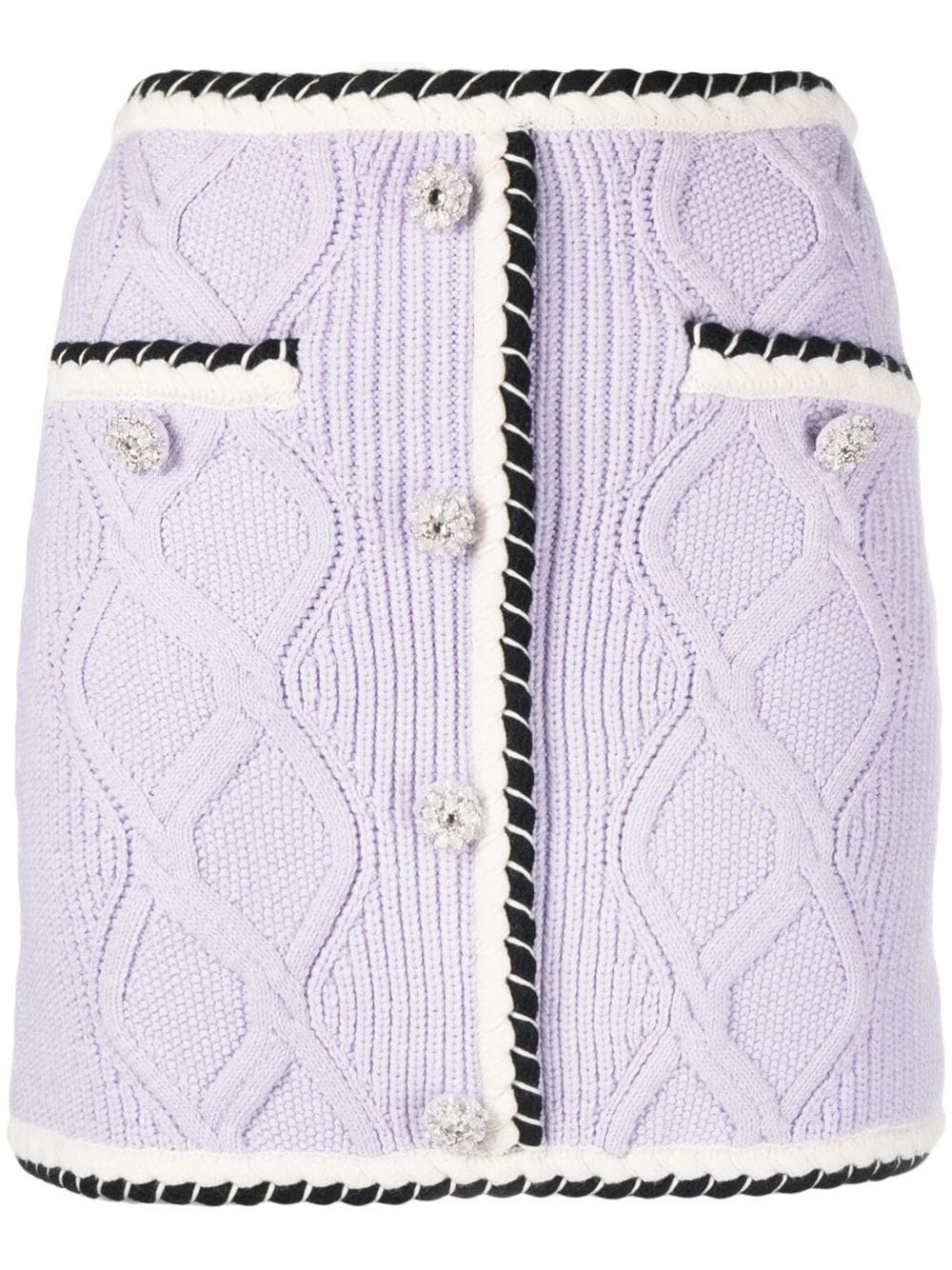 contrasting-trim cable-knit miniskirt This knitted miniskirt encapsulates Self-Portrait's refined aesthetic. Crafted from a cable knit, it is decorated with contrasting black and white trim and crystal-embellished buttons. Highlights - Lilac purple - Cable knit - Contrasting trim - Crystal-embellished buttons - Straight hem - Thigh-length Imported Composition Polyester 61%, Cotton 30%, Wool 9% SIZE & FIT Model measurements Height 5 ft 10 in(1.79 m) Bust/Chest 31.1 in(79 cm) Hips 35.03 in(89 cm) Waist 24.01 in(61 cm) FittingInformation Made with a midweight knit, this piece offers some stretch This piece fits true to size – take your usual size