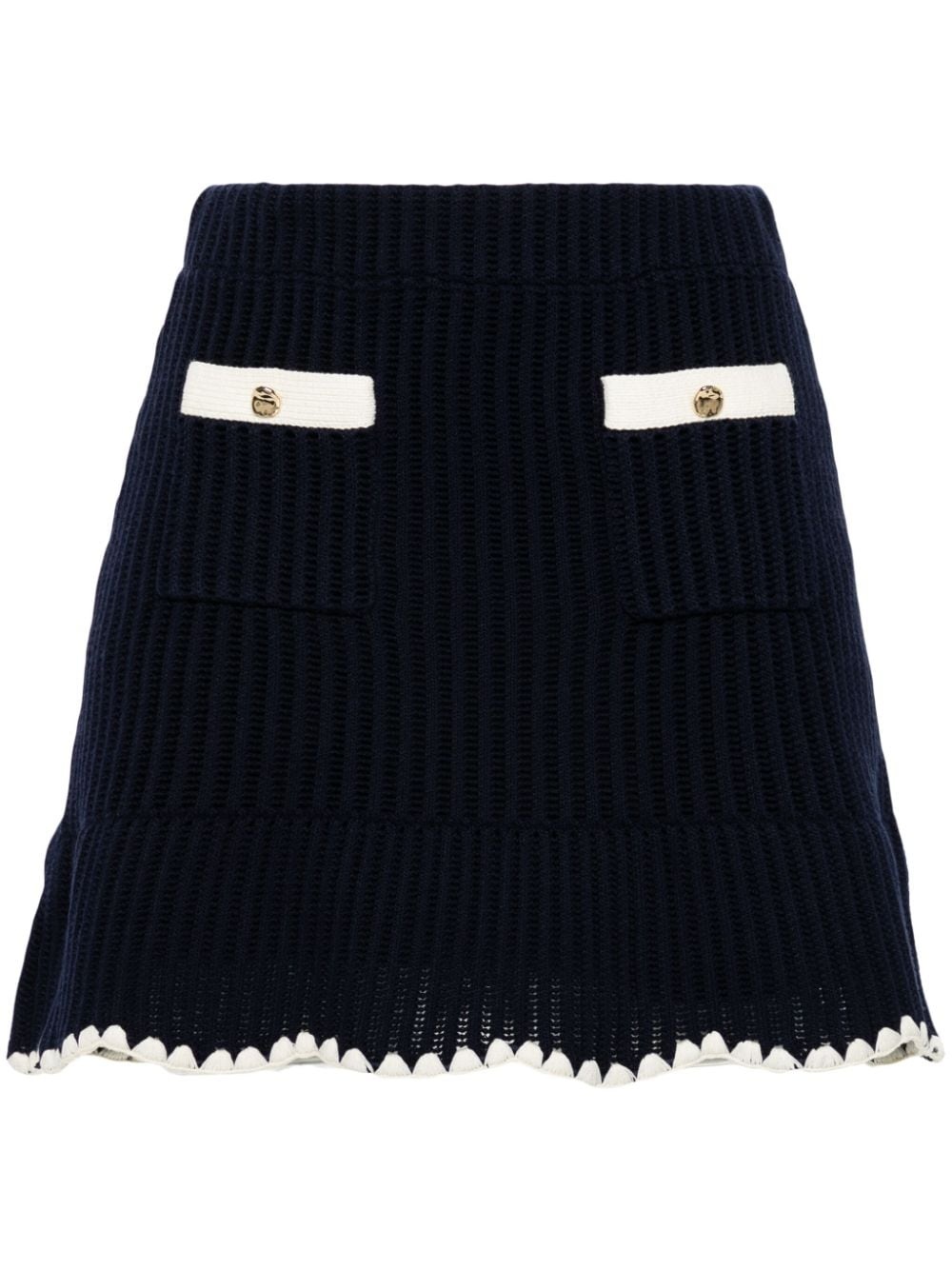 crochet-knit mini skirt Highlights - Navy blue - Crochet knit - Openwork areas - Contrasting trim - Two front patch pockets - Thigh-length - Flared scallop hem - Full lining - Elasticated waistband Imported Composition Outer: Cotton 45%, Viscose 41%, Polyamide 10%, Cashmere 4% Lining: Viscose 59%, Polyamide 38%, Spandex/Elastane 3% SIZE & FIT Model measurements Height 5 ft 9 in(1.75 m) Bust/Chest 31.1 in(79 cm) Hips 36.22 in(92 cm) Waist 25.19 in(64 cm) Measurement LENGTH 17.32 in(44 cm) WAIST 28.34 in(72 cm) FittingInformation This mini-length skirt is intended to be worn just below the waist The elasticated waist allows for a comfortable fit Made with a midweight knit, this piece offers some stretch This piece fits true to size – take your usual size Washing instructions Dry Clean Only