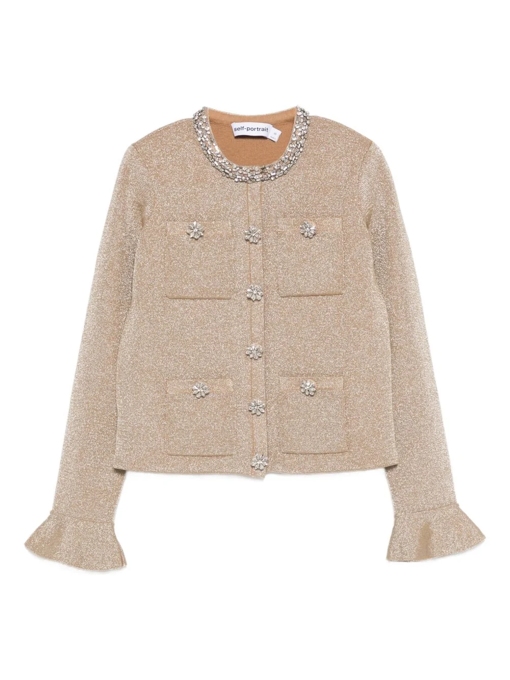crystal-embellished jacket Highlights - Gold-tone - Crystal embellishment - Press-stud fastening - Front pockets - Ruffled cuffs Imported Composition Cotton 33%, Polyester 22%, Viscose 22%, Metallised Fibres 14%, Wool 8% SIZE & FIT Model measurements Height 5 ft 8 in(1.73 m) Bust/Chest 29.92 in(76 cm) Hips 33.07 in(84 cm) Waist 23.22 in(59 cm) Washing instructions Read Manufacturer Guidelines