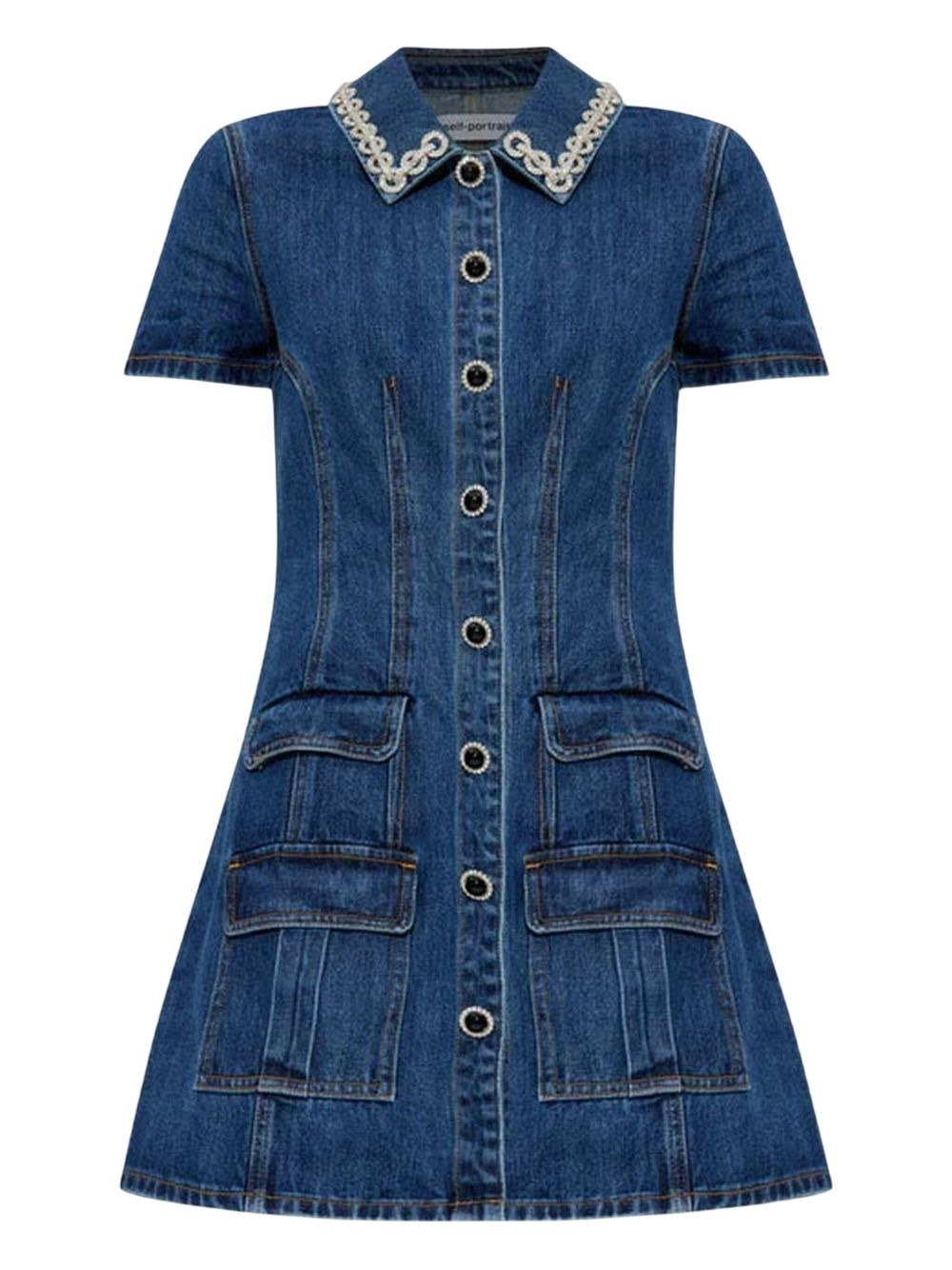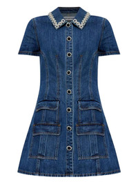 crystal-trimmed pocketed dress Highlights - Blue - Crystal-embellished collar - Short sleeves - Button front - Multiple pockets - A-line shape Imported Composition Denim 100% Washing instructions Read Manufacturer Guidelines