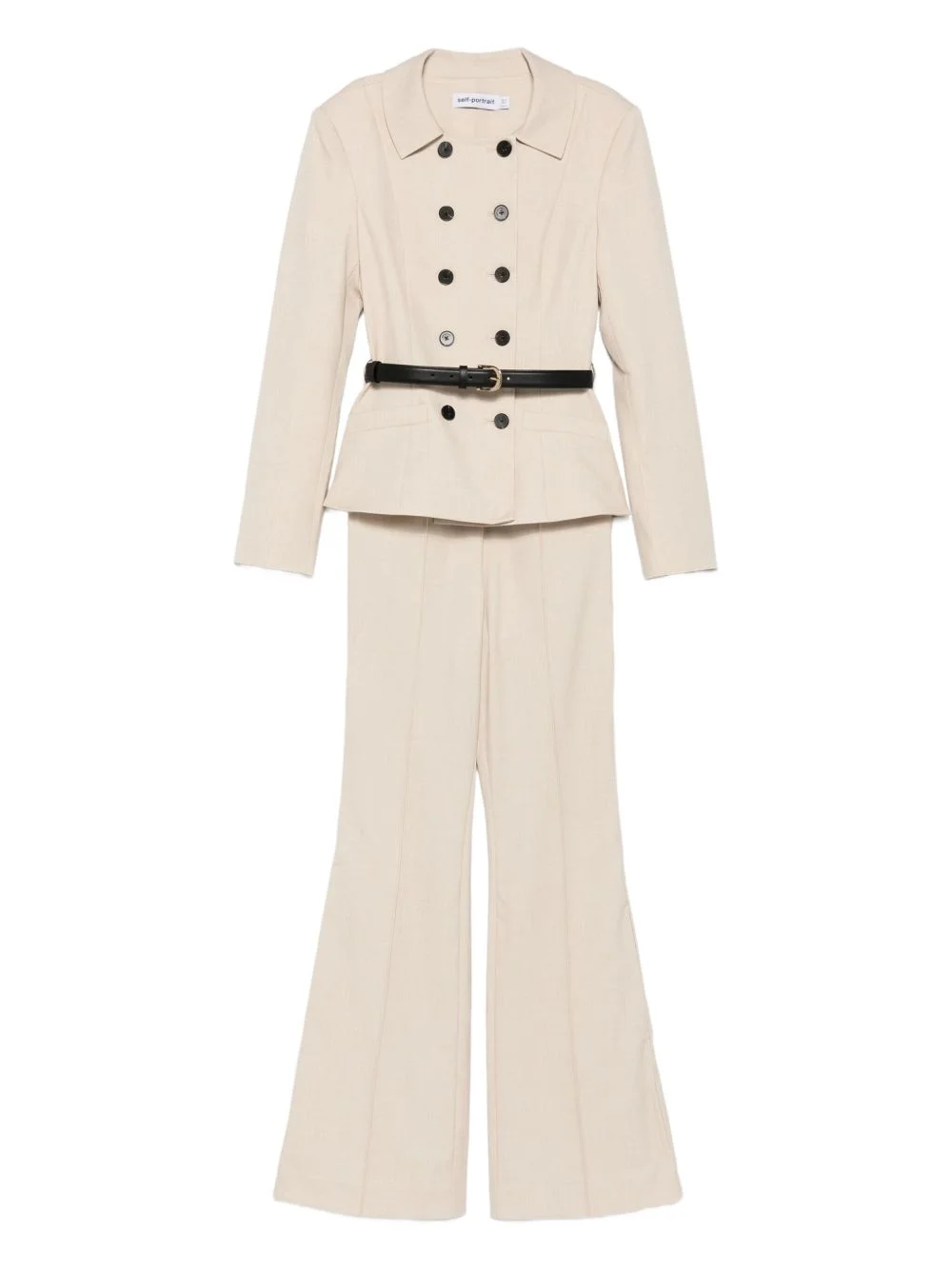 double-breasted belted jumpsuit Highlights - Beige - Double-breasted button fastening - Belted waist - Flared hem - Straight collar - Long sleeves Imported Composition Outer: Polyester 78%, Viscose 10%, Wool 8% Lining: Polyester 100% SIZE & FIT Model measurements Height 5 ft 11 in(1.8 m) Bust/Chest 31.49 in(80 cm) Hips 36.61 in(93 cm) Waist 24.4 in(62 cm) Washing instructions Read Manufacturer Guidelines