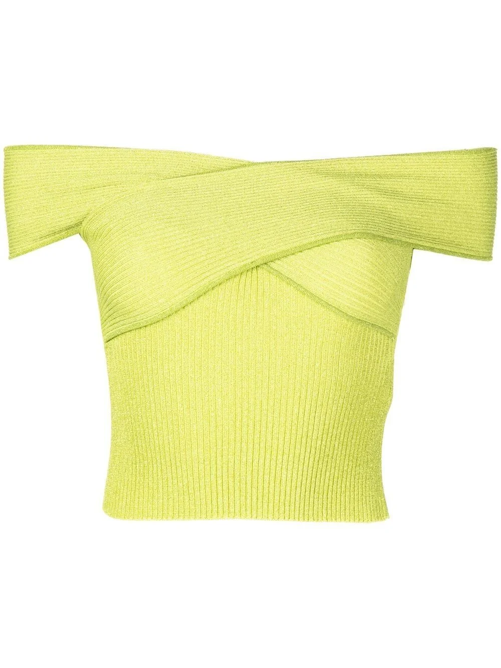 draped off-shoulder top lime green ribbed knit draped detailing lurex detailing off-shoulder short sleeves straight hem Imported Composition Viscose 40%, Polyester 26%, Polyamide 24%, Metallized Polyester 10% SIZE & FIT Model measurements Height 5 ft 11 in(1.8 m) Bust/Chest 28.34 in(72 cm) Hips 35.43 in(90 cm) Waist 23.62 in(60 cm) FittingInformation This piece fits true to size. We recommend you get your regular size Cut for a close fit Made with a mid-weight fabric Washing instructions Dry Clean Only