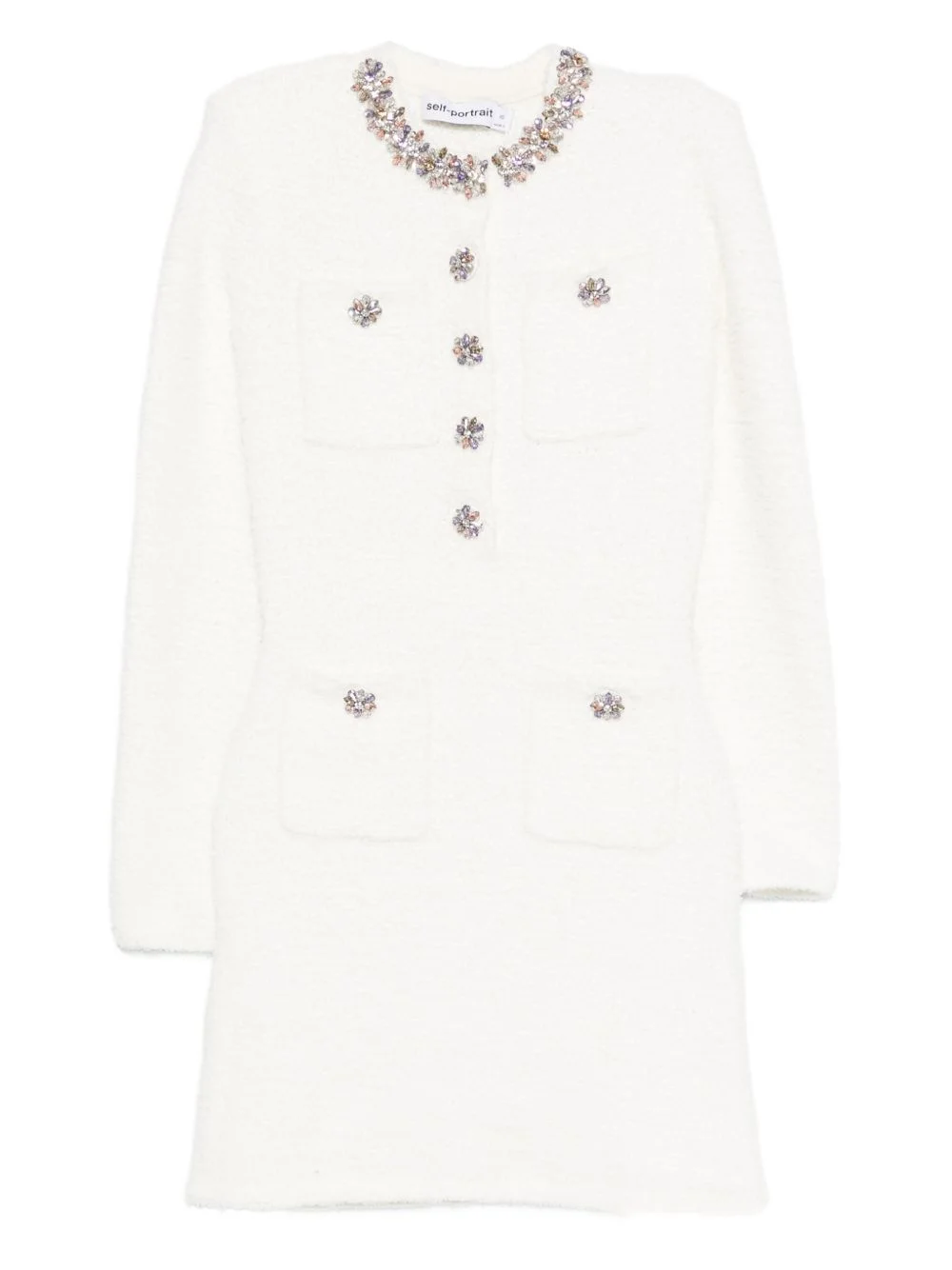 embellished pocket mini dress Highlights - White - Jewel neckline - Embellished buttons - Two front pockets - Embellished pocket flaps - Long sleeves Imported Composition Polyester 46%, Cotton 44%, Polyamide 10% SIZE & FIT Model measurements Height 5 ft 9 in(1.75 m) Bust/Chest 32.67 in(83 cm) Hips 36.22 in(92 cm) Waist 24.8 in(63 cm) Washing instructions Dry Clean Only
