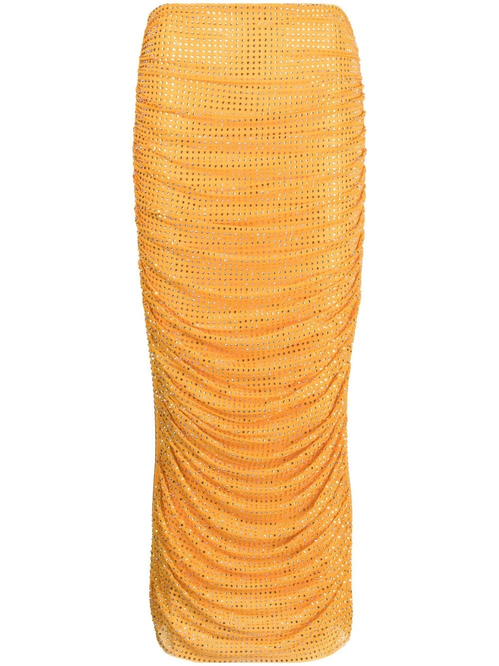 embellished ruched midi skirt Channelling a sense of ‘90s nostalgia, this orange midi skirt from Self-Portrait is crafted from ruched stretch jersey and adorned with hot-fix rhinestones. Highlights - Orange - Stretch-design - Jersey texture - Ruched detailing - Rhinestone embellishment - High waist - Mid-length Made in Italy Composition Outer: Polyester 95%, Spandex/Elastane 5% Lining: Polyester 95%, Spandex/Elastane 5% SIZE & FIT Measurement HIPS 25.98 in(66 cm) LENGTH 31.49 in(80 cm) WAIST 22.83 in(58 cm) Washing instructions Dry Clean Only