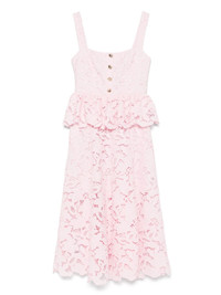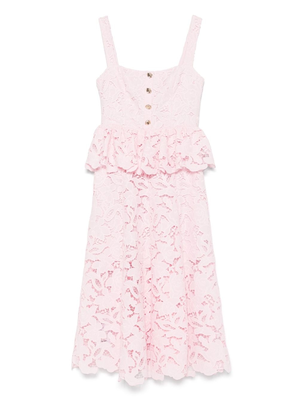 floral-lace midi dress Highlights - Light pink - Front button placket - Concealed rear zip fastening - Peplum waist - Sleeveless Imported Composition Polyester 100% SIZE & FIT Model measurements Height 5 ft 9 in(1.75 m) Bust/Chest 32.67 in(83 cm) Hips 36.22 in(92 cm) Waist 24.8 in(63 cm) FittingInformation Designed for a close fit at the chest and waist with a loose fit at the hip The internal slip sits just away from the body, offering a close yet comfortable fit Made from a midweight non-stretch fabric Washing instructions Dry Clean Only