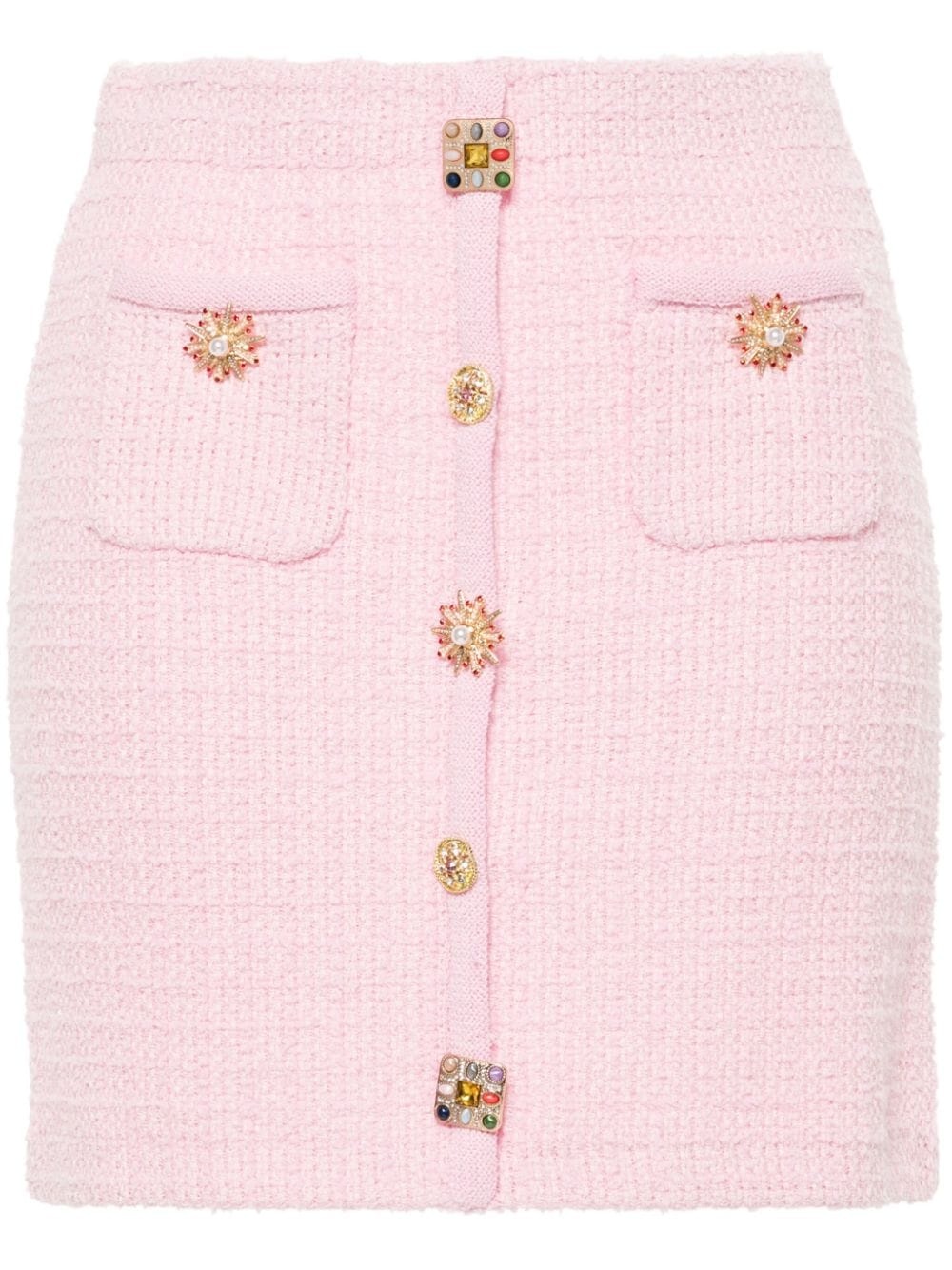 jewelry-buttons knitted mini skirt Highlights - Light pink - Knitted boucle construction - Micro-sequin embellishment - Two front pouch pockets - Decorative jewelry-buttons detailing - Thigh-length - Straight hem - Elasticated waistband Made in Italy Composition Viscose 41%, Polyamide 39%, Cotton 20% SIZE & FIT Model measurements Height 5 ft 9 in(1.75 m) Bust/Chest 31.1 in(79 cm) Hips 36.22 in(92 cm) Waist 25.19 in(64 cm) FittingInformation This mini-length skirt is intended to be worn just below the waist The elasticated waist allows for a comfortable fit Made with a midweight knit, this piece offers some stretch This piece fits true to size – take your usual size Washing instructions Dry Clean Only
