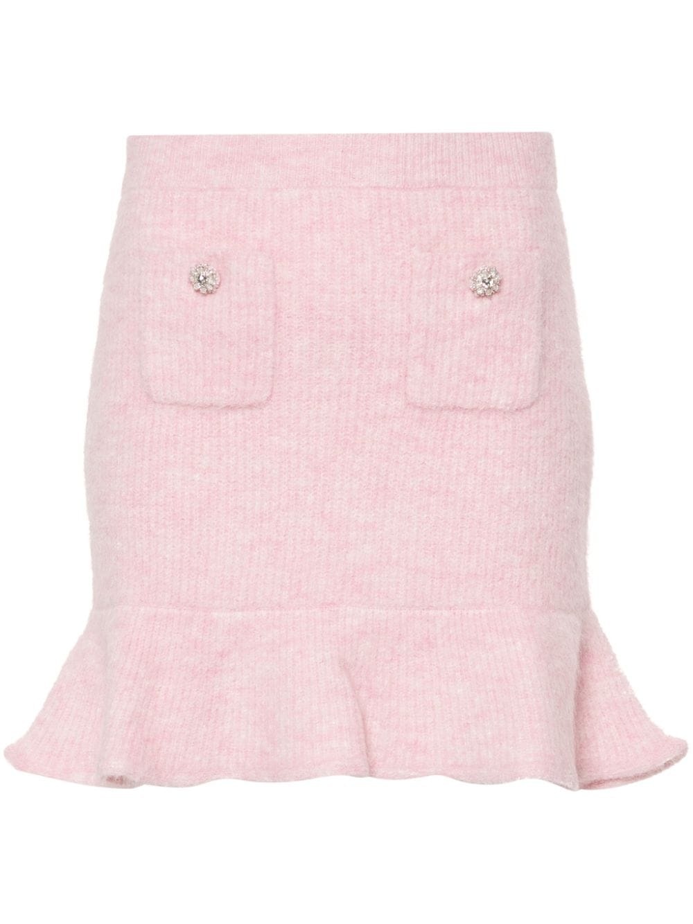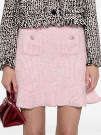 knitted mini skirt Highlights - Light pink - Knitted construction - Brushed effect - Melange effect - Two front patch pockets - Crystal-embellished buttons - Thigh-length - Ruffle hem - Elasticated waistband Made in United Kingdom Composition Alpaca Wool 49%, Acrylic 18%, Polyamide 17%, Polyester 14%, Elastane 2% SIZE & FIT Model measurements Height 5 ft 9 in(1.75 m) Bust/Chest 31.1 in(79 cm) Hips 36.22 in(92 cm) Waist 25.19 in(64 cm) FittingInformation This mini-length skirt is intended to be worn just below the waist The elasticated waist allows for a comfortable fit Made with a midweight knit, this piece offers some stretch This piece fits true to size – take your usual size