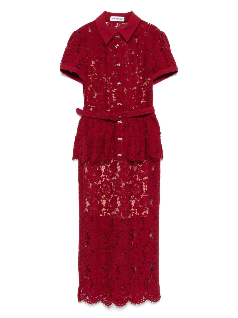 lace peplum dress Highlights - Burgundy - Concealed side zip fastening - Detachable belt - Peplum waist - Crystal embellishment Imported Composition Polyamide 70%, Cotton 30% SIZE & FIT Model measurements Height 5 ft 9 in(1.75 m) Bust/Chest 34.64 in(88 cm) Hips 36.61 in(93 cm) Waist 26.37 in(67 cm) FittingInformation Designed for a close fit throughout The belt offers adjustability for fitted preferences Made from a midweight non-stretch fabric