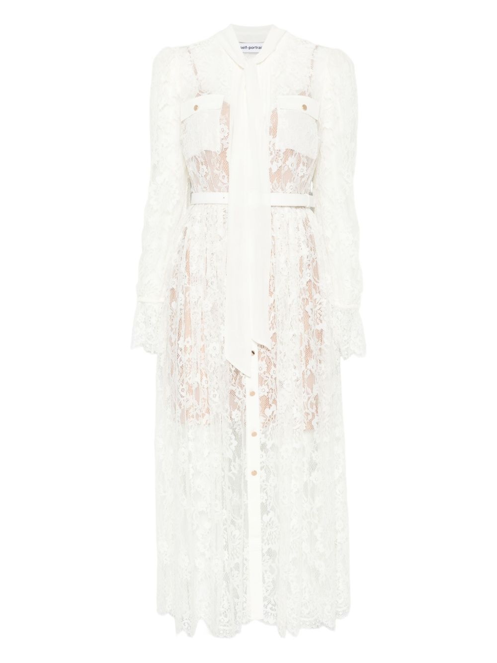 lace pussy-bow midi dress Highlights - White - Lace panels - Belted waist - Button front - Long sleeves - Pussy-bow fastening Imported Composition Polyester 100% SIZE & FIT Model measurements Height 5 ft 10 in(1.78 m) Bust/Chest 33.85 in(86 cm) Hips 36.61 in(93 cm) Waist 26.77 in(68 cm) Washing instructions Machine Wash