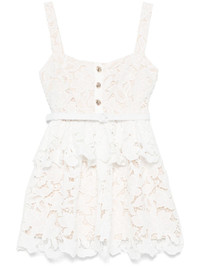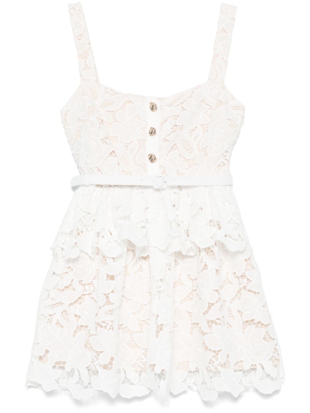 lace tiered mini dress Highlights - White - Concealed side hook and zip fastening - Short front button fastening - Detachable and adjustable waist belt - Full lining Imported Composition Lining: Polyester 100% Outer: Polyester 100% SIZE & FIT Model measurements Height 5 ft 11 in(1.8 m) Bust/Chest 31.49 in(80 cm) Hips 36.61 in(93 cm) Waist 24.4 in(62 cm) FittingInformation Designed for a close fit at the chest and waist with a loose fit at the hip The internal slip sits just away from the body, offering a close yet comfortable fit Made from a midweight non-stretch fabric