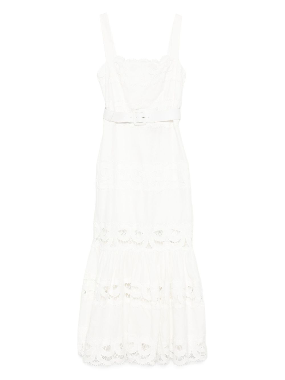 lace-trimmed dress Highlights - White - Tiered lace trim - Belted waist - Sleeveless - Square neck - Embroidered lace Imported Composition Outer: Linen/Flax 52%, Cotton 48% Lining: Cotton 100% SIZE & FIT Model measurements Height 5 ft 9 in(1.75 m) Bust/Chest 32.67 in(83 cm) Hips 36.22 in(92 cm) Waist 24.8 in(63 cm) FittingInformation Designed for a slim fit that sits just away from the body offering a close yet comfortable fit Made from a midweight non-stretch fabric Washing instructions Dry Clean Only