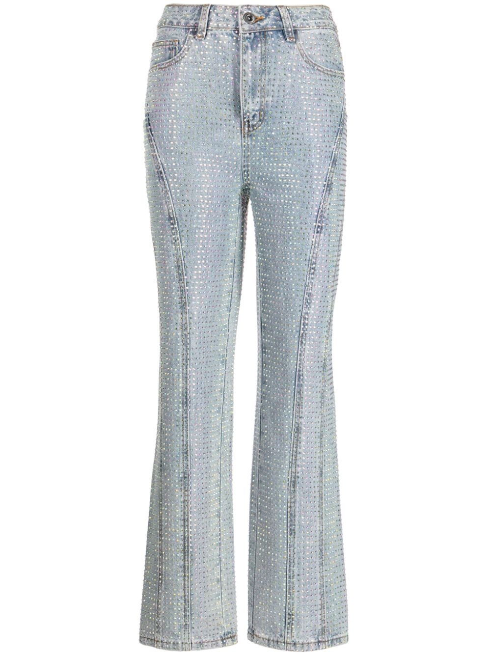 mid-rise embellished flared jeans Highlights - Light blue - Cotton - Denim - Light wash - Mini logo tag - Rhinestone embellishment - Mid-rise - Flared - Button fly fastening - Belt loops - Classic five pockets Imported Composition Polyester 67%, Cotton 33% Outer: Cotton 100% SIZE & FIT Measurement FRONT RISE 11.02 in(28 cm) HIPS 38.58 in(98 cm) WAIST 25.98 in(66 cm)
