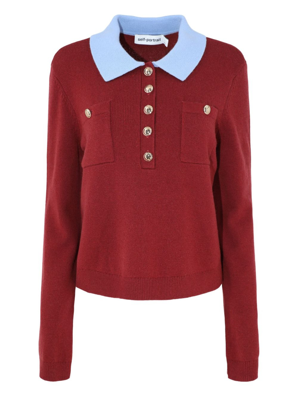 patch-pockets knitted polo top Highlights - Red - Blue collar - Polo collar - Button fastening - Long sleeves - Patch pockets Imported Composition Fabric 100% Washing instructions Read Manufacturer Guidelines