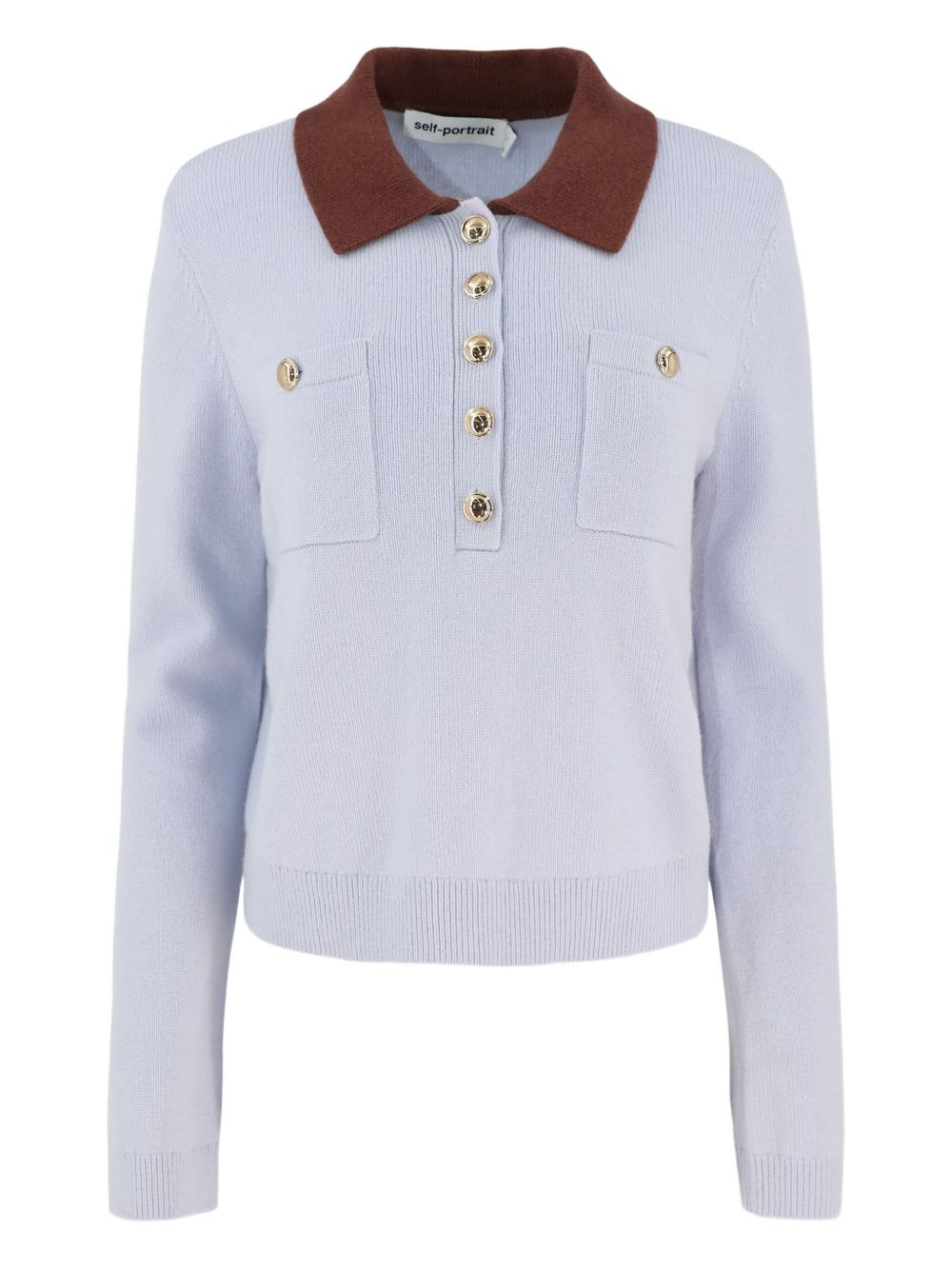 patch-pockets knitted polo top Highlights - Blue - Brown collar - Button fastening - Long sleeves - Patch pockets - Ribbed hem Imported Composition Fabric 100% Washing instructions Read Manufacturer Guidelines