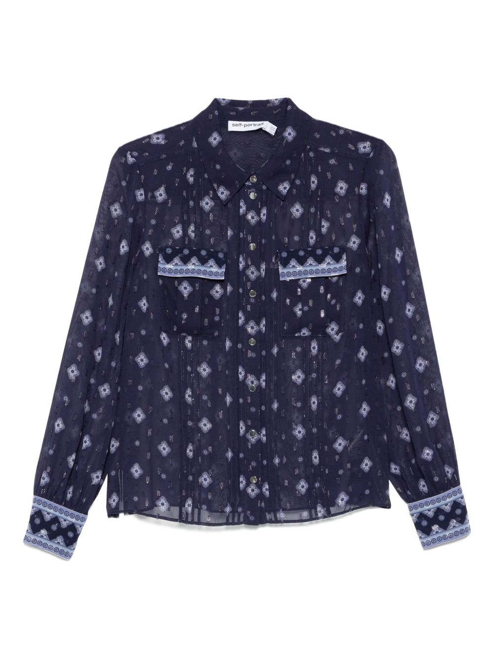 patterned chiffon blouse Highlights - Blue - Geometric pattern - Long sleeves - Button fastening - Chest pockets Imported Composition Outer: Polyester 98%, Metallised Fibres 2% SIZE & FIT Model measurements Height 5 ft 10 in(1.78 m) Bust/Chest 33.85 in(86 cm) Hips 36.61 in(93 cm) Waist 26.77 in(68 cm) Washing instructions Dry Clean Only