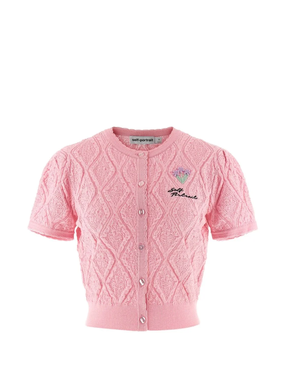 pointelle knit top Highlights - Pink - Pointelle knit - Front button closure - Short sleeves - Crew neck Imported Composition Cotton 65%, Polyester 21%, Polyamide 14% Washing instructions Read Manufacturer Guidelines
