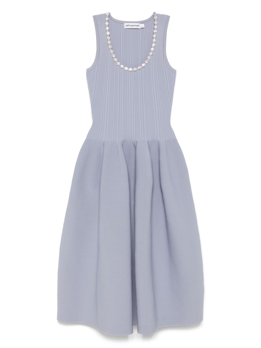 rhinestone-embellished midi dress Highlights - Powder blue - Scoop neck - Sleeveless Made in Italy Composition Outer: glass 100%, Polyester 86%, Polyamide 13%, Elastane 1% SIZE & FIT Model measurements Height 5 ft 9 in(1.76 m) Bust/Chest 31.88 in(81 cm) Hips 35.43 in(90 cm) Waist 24.8 in(63 cm) Measurement LENGTH 46.06 in(117 cm) FittingInformation Designed for a close fit at the chest and waist with a loose fit at the hip Made with a midweight knit, this piece offers some stretch Washing instructions Dry Clean Only