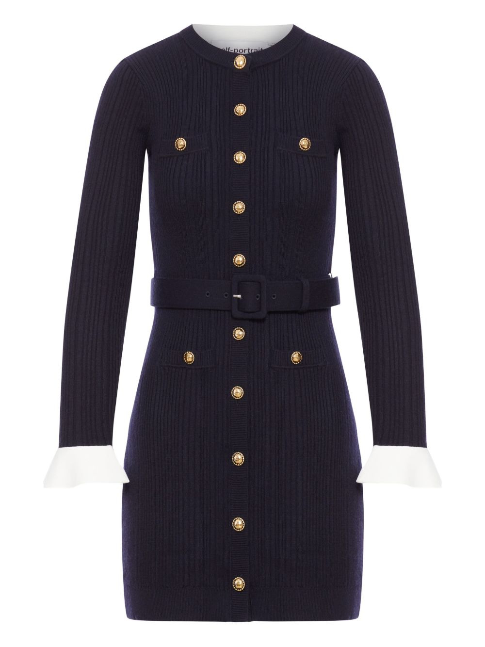 ribbed button-front dress Highlights - Blue - Ribbed knit - Gold button embellishment - Removable belt - Four patch pockets - Contrast cuffs Imported Composition Polyamide 42%, Viscose 23%, Polyester 18%, Wool 14%, Cashmere 3% Washing instructions Read Manufacturer Guidelines
