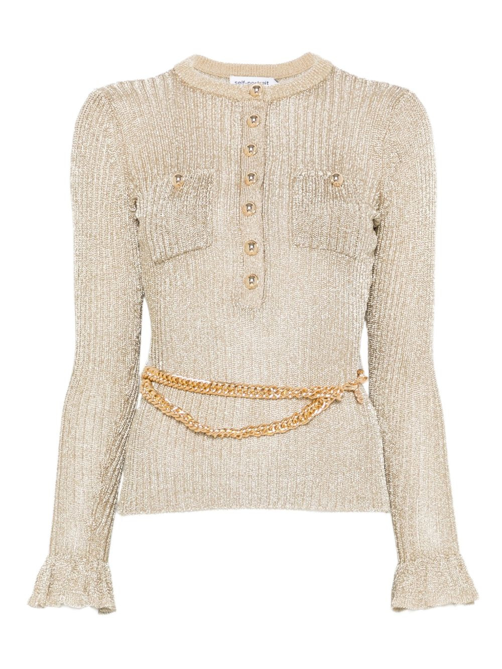 ribbed-knit lurex jumper Highlights - Gold-tone - Ribbed knit - Lurex detailing - Front button placket - Ruffled cuffs Imported Composition Viscose 65%, Metallic Fibre 35% SIZE & FIT Model measurements Height 5 ft 11 in(1.8 m) Bust/Chest 31.49 in(80 cm) Hips 36.61 in(93 cm) Waist 24.4 in(62 cm) Washing instructions Read Manufacturer Guidelines