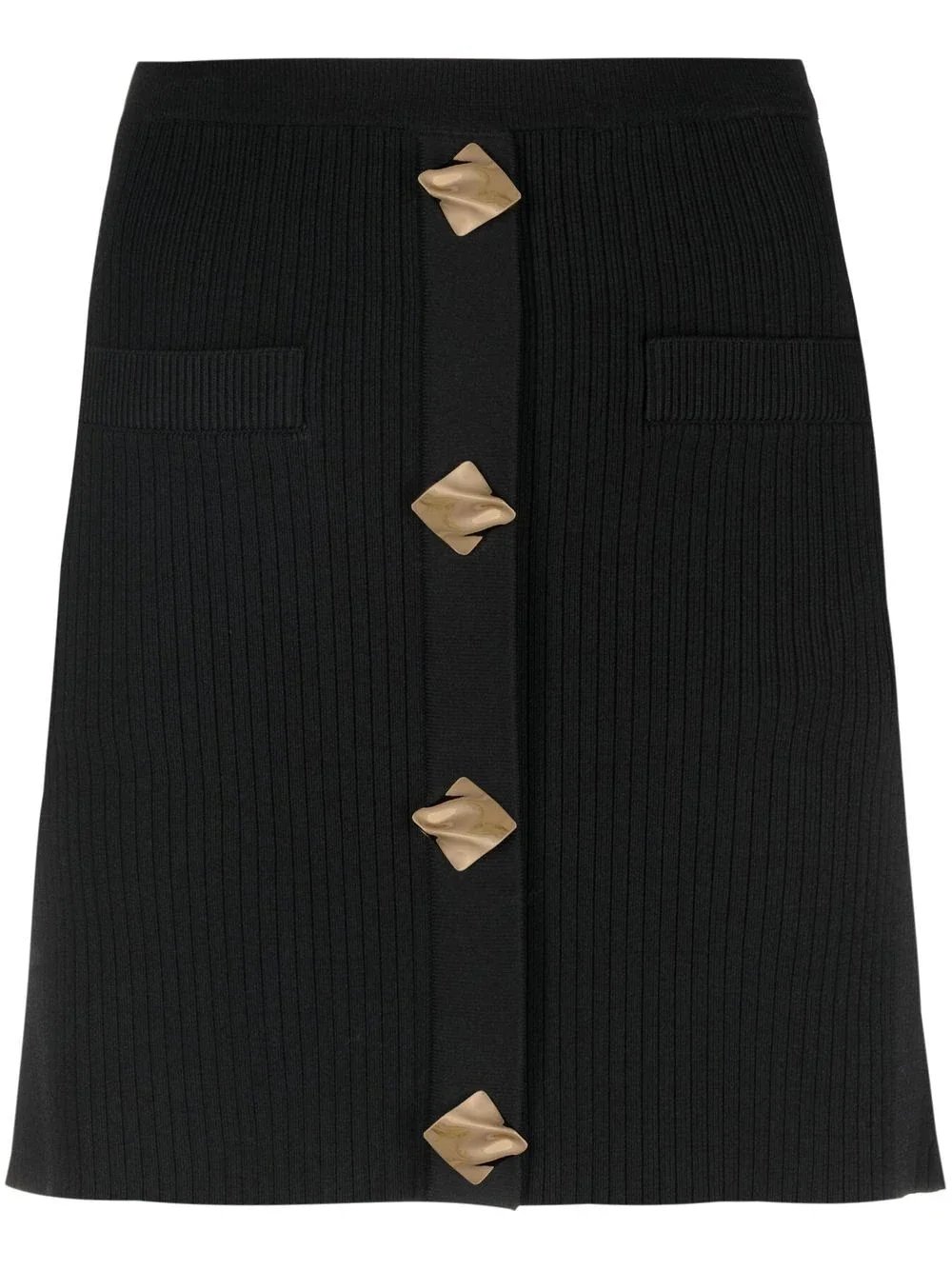 ribbed-knit mini skirt Self-Portrait elevates this ribbed knit-mini skirt with the addition of gold-tone buttons for a contemporary touch to a classic silhouette. Imported Composition Viscose 60%, Polyamide 39%, Elastane 1% SIZE & FIT Model measurements Height 5 ft 10 in(1.78 m) Bust/Chest 30.31 in(77 cm) Hips 36.61 in(93 cm) Waist 24.8 in(63 cm) FittingInformation This piece fits true to size. We recommend you get your regular size Cut for a slim fit Made with a mid-weight stretch fabric