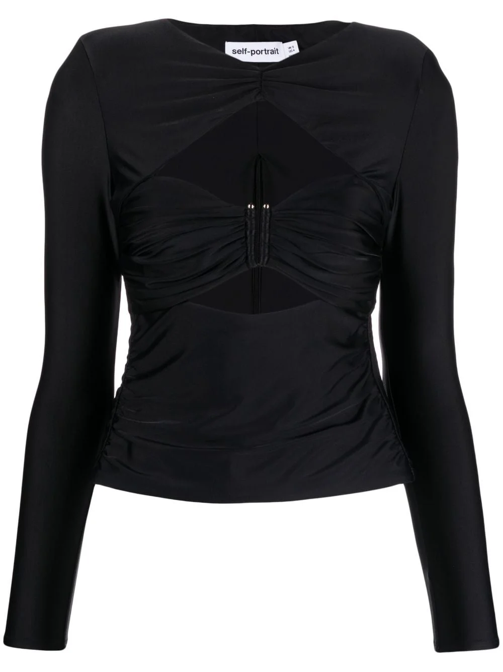 ruched cut-out top Self-Portrait forgoes its signature romantic details for a sultrier silhouette in this black top. Infused with plenty of stretch for comfort, the ruched design is enhanced with two cut-outs across the front. Highlights - Black - Stretch-design - Cut-out detailing - Ruched detailing - Long sleeves - Straight hem Imported Composition Outer: Polyamide 80%, Elastane 20% Lining: Polyamide 80%, Elastane 20% SIZE & FIT Model measurements Height 5 ft 10 in(1.77 m) Bust/Chest 31.49 in(80 cm) Hips 35.03 in(89 cm) Waist 23.22 in(59 cm) Measurement SLEEVE LENGTH 18.11 in(46 cm) LENGTH 18.5 in(47 cm) WAIST 22.04 in(56 cm) BUST 28.34 in(72 cm) FittingInformation Designed for a close fit throughout Made from a midweight stretch fabric, this piece offers elasticity and flexibility when worn This piece fits true to size – take your usual size Washing instructions Dry Clean Only