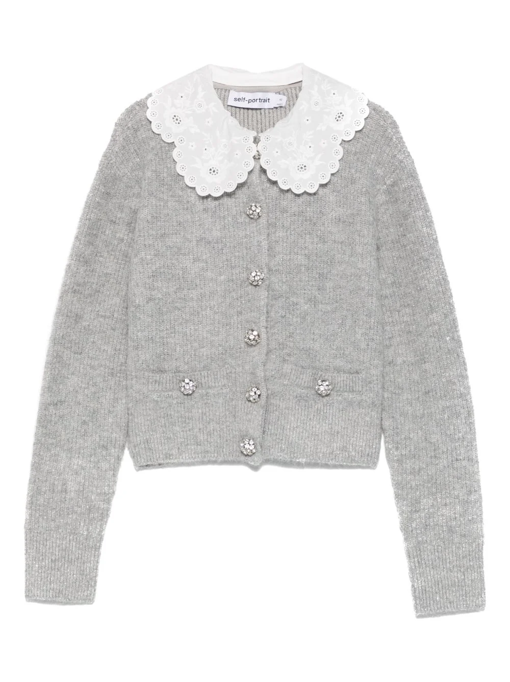 scalloped-collar embellished cardigan Highlights - Grey - Scalloped collar - Embellished buttons - Front pockets - Knit construction Imported Composition Cotton 100%, Polyester 45%, Polyamide 32%, Alpaca 15%, Wool 5%, Metallic Fibre 2%, Elastane 1% SIZE & FIT Model measurements Height 5 ft 9 in(1.75 m) Bust/Chest 32.67 in(83 cm) Hips 36.22 in(92 cm) Waist 24.8 in(63 cm) Washing instructions Dry Clean Only