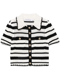 striped crochet top Highlights - Black - Front button fastening - Two chest patch pockets - Classic collar - Short sleeves Imported Composition Cotton 45%, Viscose 42%, Polyamide 10%, Cashmere 3% SIZE & FIT Model measurements Height 5 ft 11 in(1.8 m) Bust/Chest 32.67 in(83 cm) Hips 36.22 in(92 cm) Waist 24.4 in(62 cm) FittingInformation Designed for a close fit throughout Made from a midweight non-stretch fabric, this piece offers minimal elasticity when worn Washing instructions Dry Clean Only