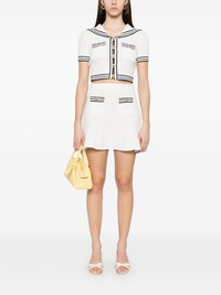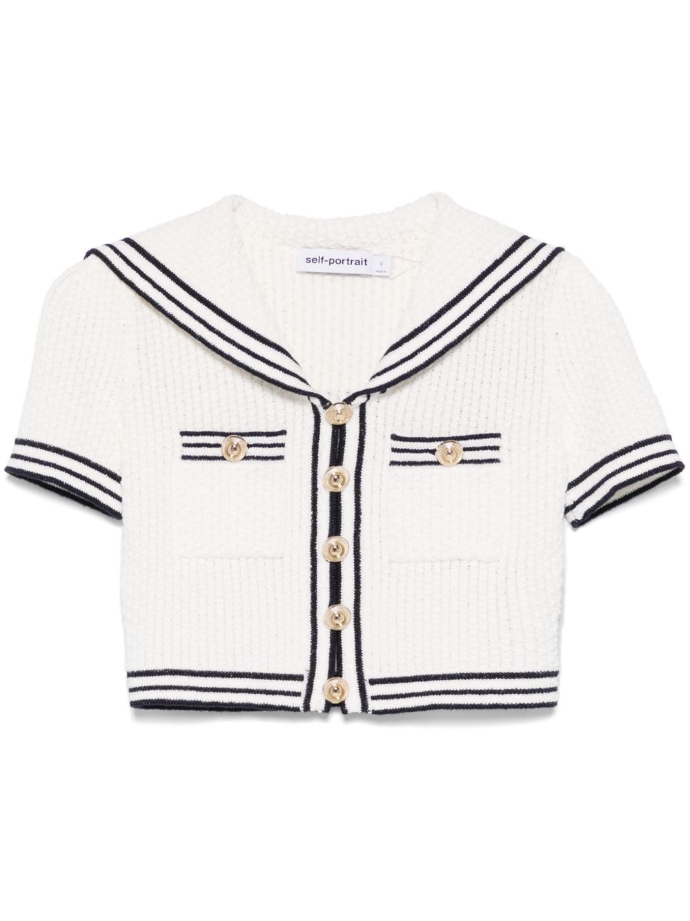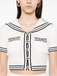 textured knitted top Highlights - White/blue - Front button fastening - Stripe detailing - Two chest patch pockets - Short sleeves Imported Composition Cotton 55%, Polyester 24%, Polyamide 21% SIZE & FIT Model measurements Height 5 ft 10 in(1.78 m) Bust/Chest 33.85 in(86 cm) Hips 36.61 in(93 cm) Waist 26.77 in(68 cm) FittingInformation Designed for a slim fit that sits just away from the body offering a close yet comfortable fit Cropped in length Made with a midweight knit, this piece offers some stretch Washing instructions Dry Clean Only