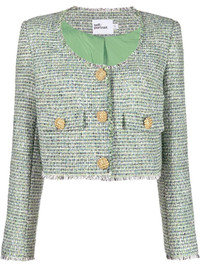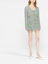 tweed scoop-neck jacket tweed scoop-neck jacket from SELF-PORTRAIT featuring green, tweed, scoop neck, long sleeves, frayed hem and gold-tone buttons. Made in United Kingdom Composition Outer: Polyester 98%, Other fibres 2% Lining: Polyester 100% SIZE & FIT Model measurements Height 5 ft 10 in(1.78 m) Bust/Chest 31.49 in(80 cm) Hips 35.43 in(90 cm) Waist 24.4 in(62 cm) Measurement SLEEVE LENGTH 25.59 in(65 cm) LENGTH 18.89 in(48 cm) Washing instructions Dry Clean Only