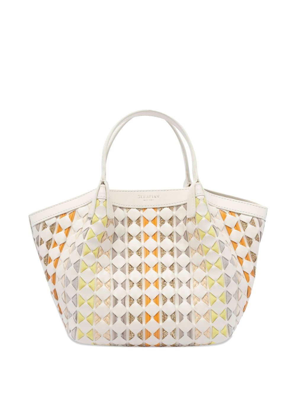 mini Mosaico Secret tote bag Highlights - Off-white - Concealed magnetic fastening - Two top handles - Detachable shoulder strap Made in Italy Composition Lining: Recycled Cotton 100% Outer: Lamb Skin 100%, Calf Leather 100% SIZE & FIT Measurement DEPTH 4.72 in(12 cm) HEIGHT 7.48 in(19 cm) WIDTH 10.62 in(27 cm)